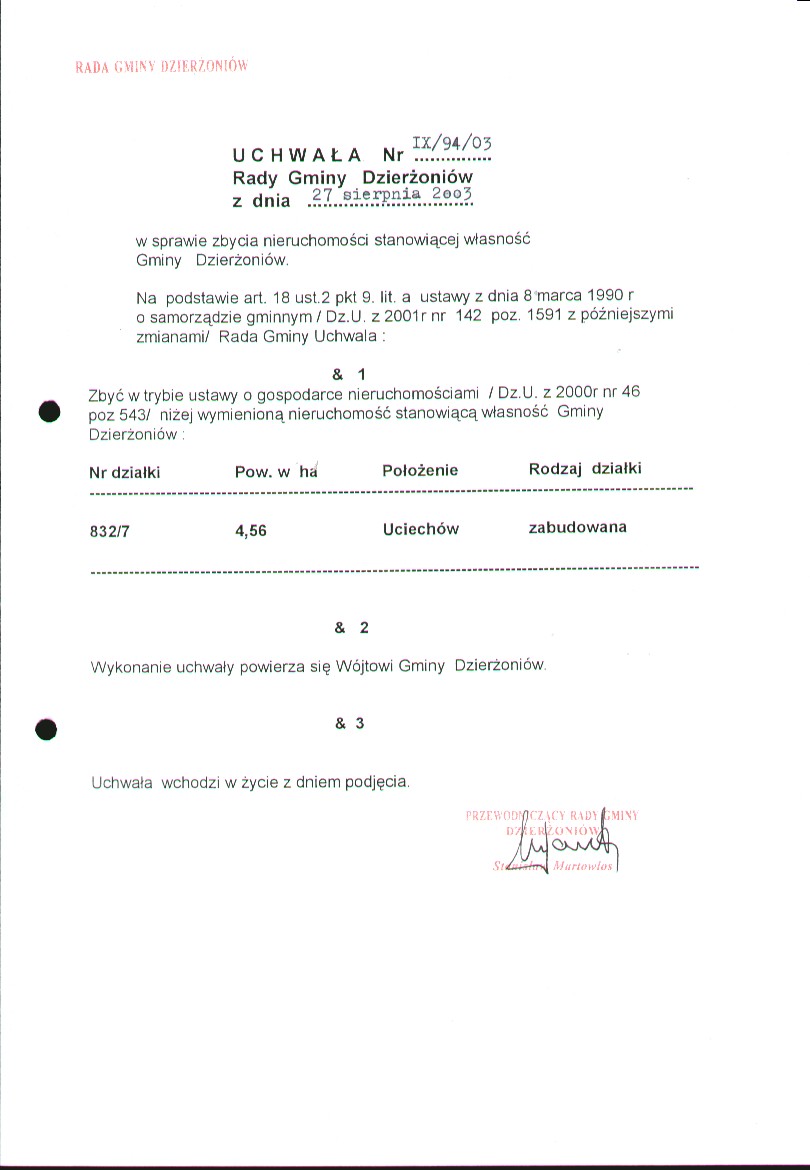 Uchwała Nr IX/94/2003 Rady Gminy Dzierżoniów w sprawie zbycia nieruchomości stanowiącej własność Gminy Dzierżoniów