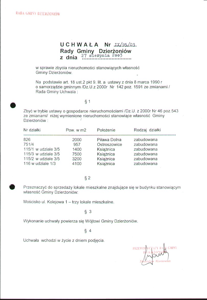 Uchwała Nr IX/95/2003 Rady Gminy Dzierżoniów w sprawie zbycia nieruchomości stanowiących własność Gminy Dzierżoniów