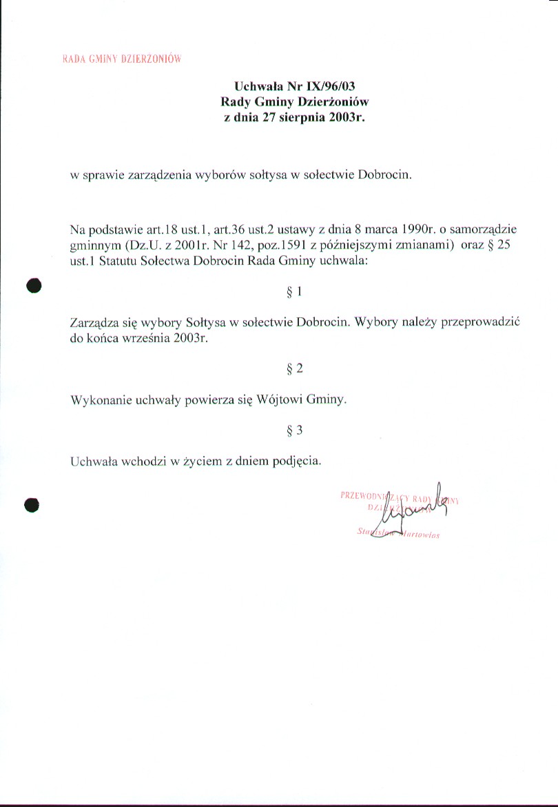 Uchwała Nr IX/96/2003 Rady Gminy Dzierżoniów w sprawie zarządzenia wyborów w sołectwie Dobrocin