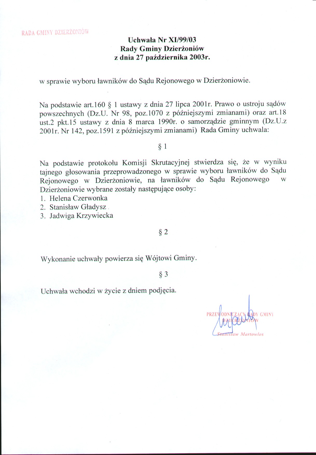 Uchwała Nr XI/99/2003 w sprawie wyborów ławników do Sądu Rejonowego w Dzierżoniowie