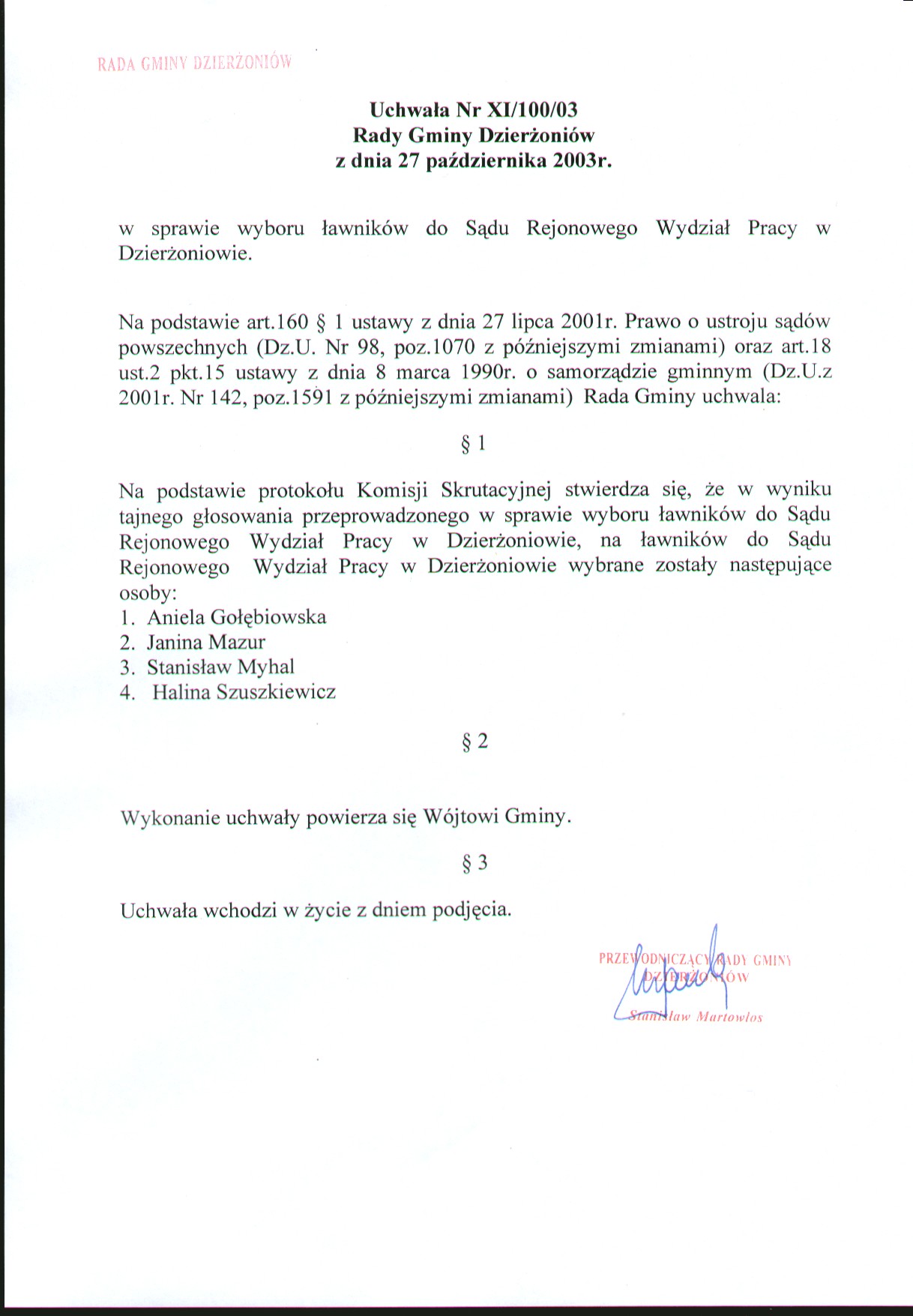 Uchwała Nr XI/100/2003 w sprawie wyboru ławników do Sądu Rejonowego Wydział Pracy w Dzierżoniowie