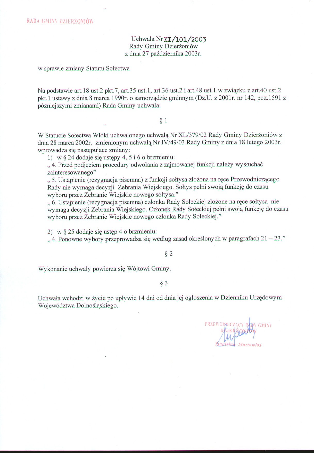 Uchwała Nr XI/101/2003 w sprawie zmiany Statutu Sołectwa Włóki