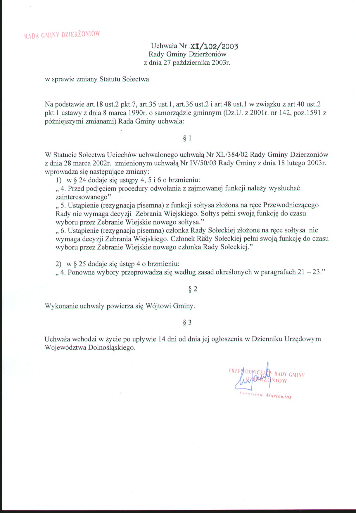Uchwała Nr XI/102/2003 w sprawie zmiany Statutu Sołectwa Uciechów