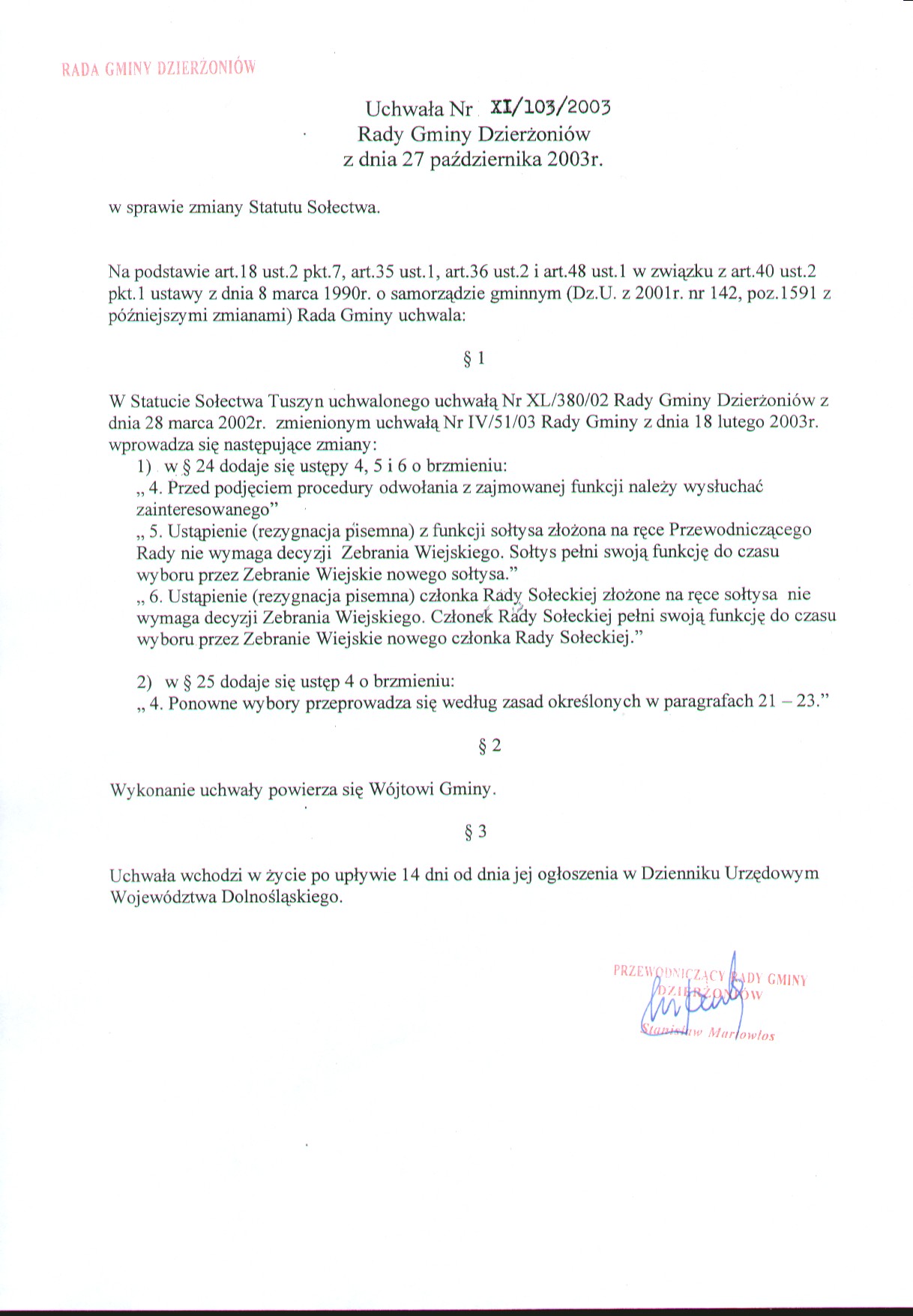 Uchwała Nr XI/103/2003 w sprawie zmiany Statutu Sołectwa Tuszyn