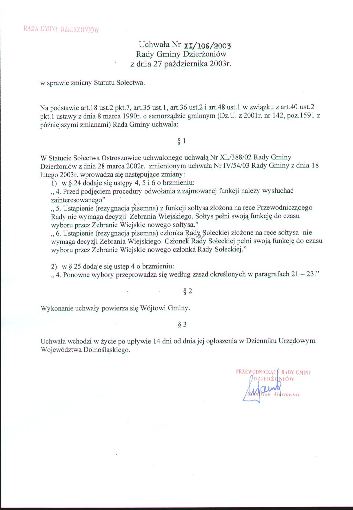 Uchwała Nr XI/106/2003 w sprawie zmiany Statutu Sołectwa Ostroszowice