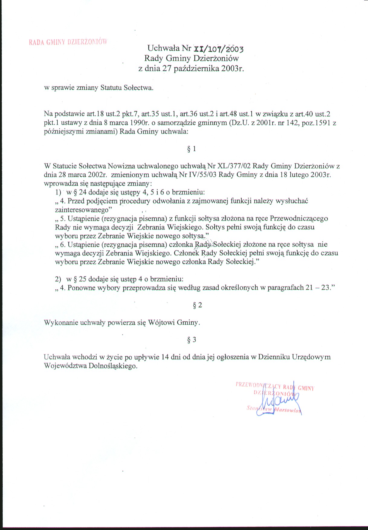 Uchwała Nr XI/107/2003 w sprawie zmiany Statutu Sołectwa Nowizna