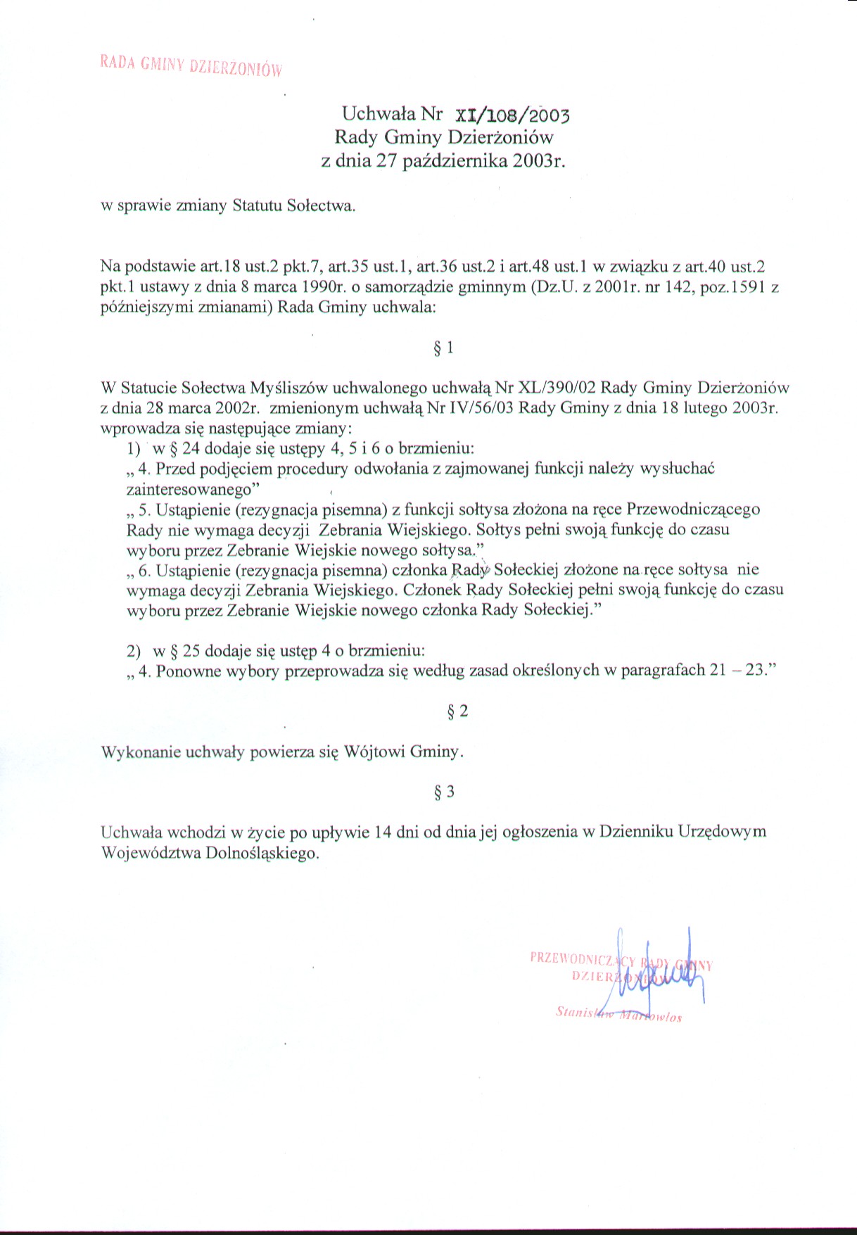 Uchwała Nr XI/108/2003 w sprawie zmiany Statutu Sołectwa Myśliszów