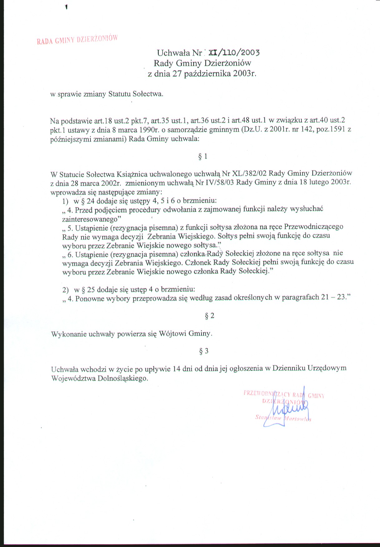 Uchwała Nr XI/110/2003 w sprawie zmiany Statutu Sołectwa Książnica