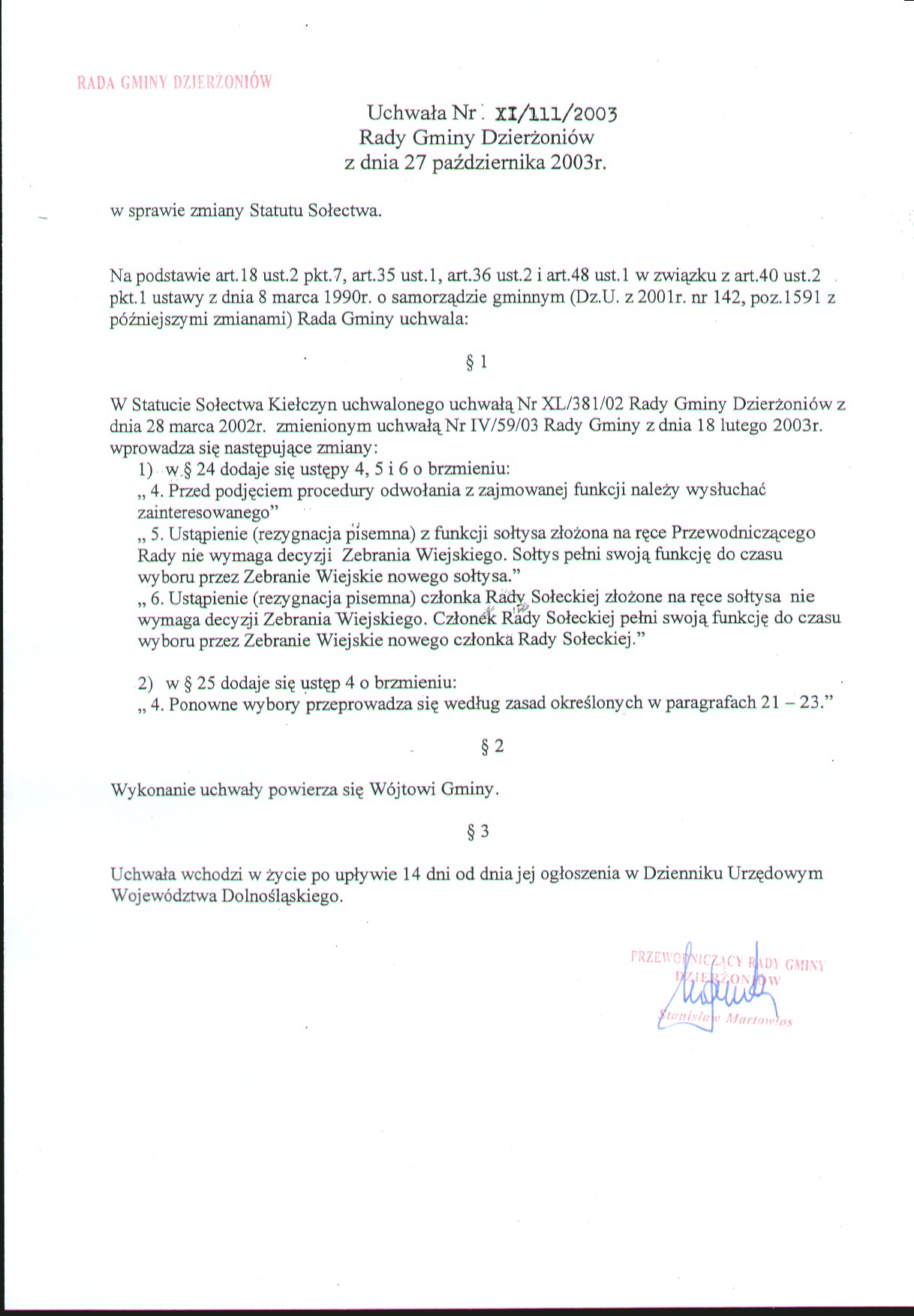 Uchwała Nr XI/111/2003 w sprawie zmiany Statutu Sołectwa Kiełczyn