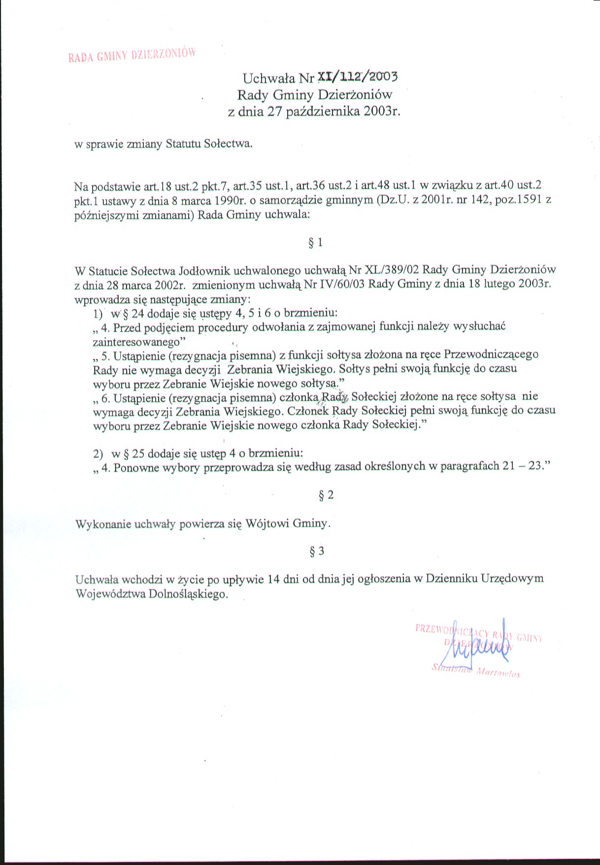 Uchwała Nr XI/112/2003 w sprawie zmiany Statutu Sołectwa Jodłownik