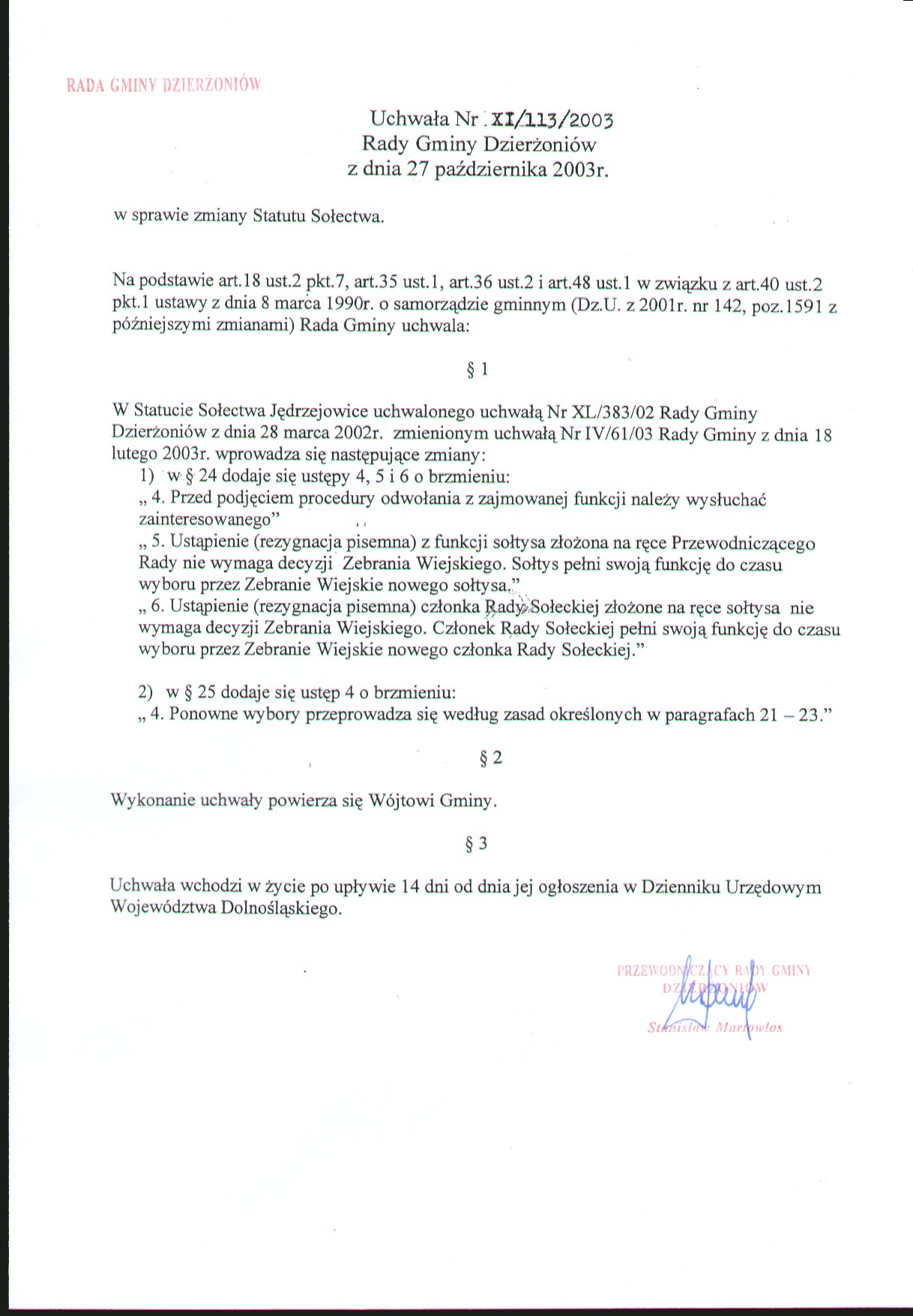 Uchwała Nr XI/113/2003 w sprawie zmiany Statutu Sołectwa Jędrzejowice