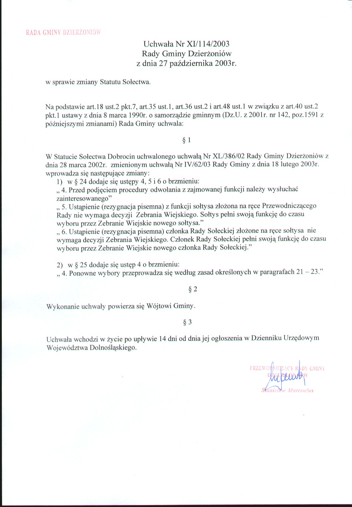 Uchwała Nr XI/114/2003 w sprawie zmiany Statutu Sołectwa Dobrocin