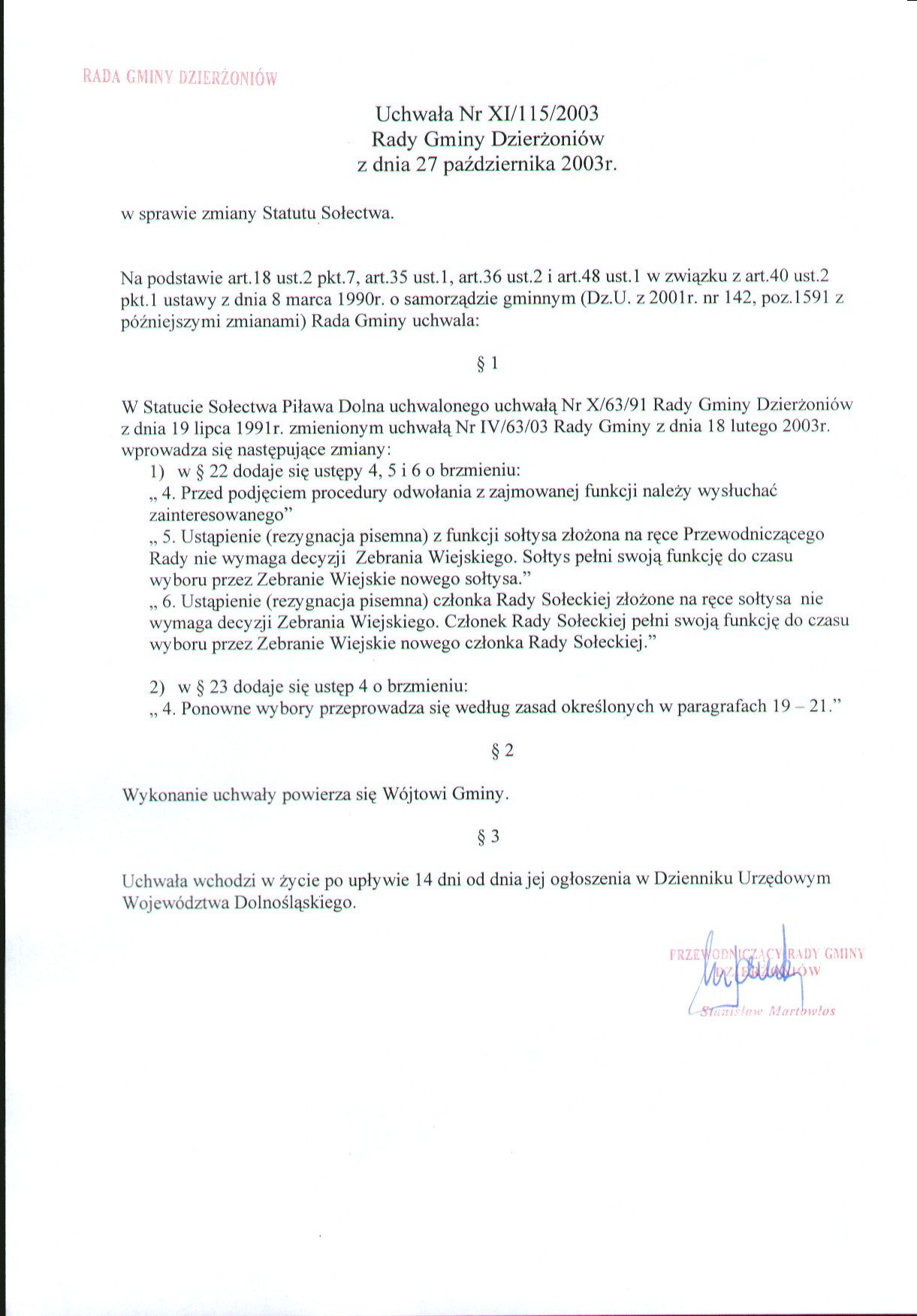 Uchwała Nr XI/115/2003 w sprawie zmiany Statutu Sołectwa Piława Dolna