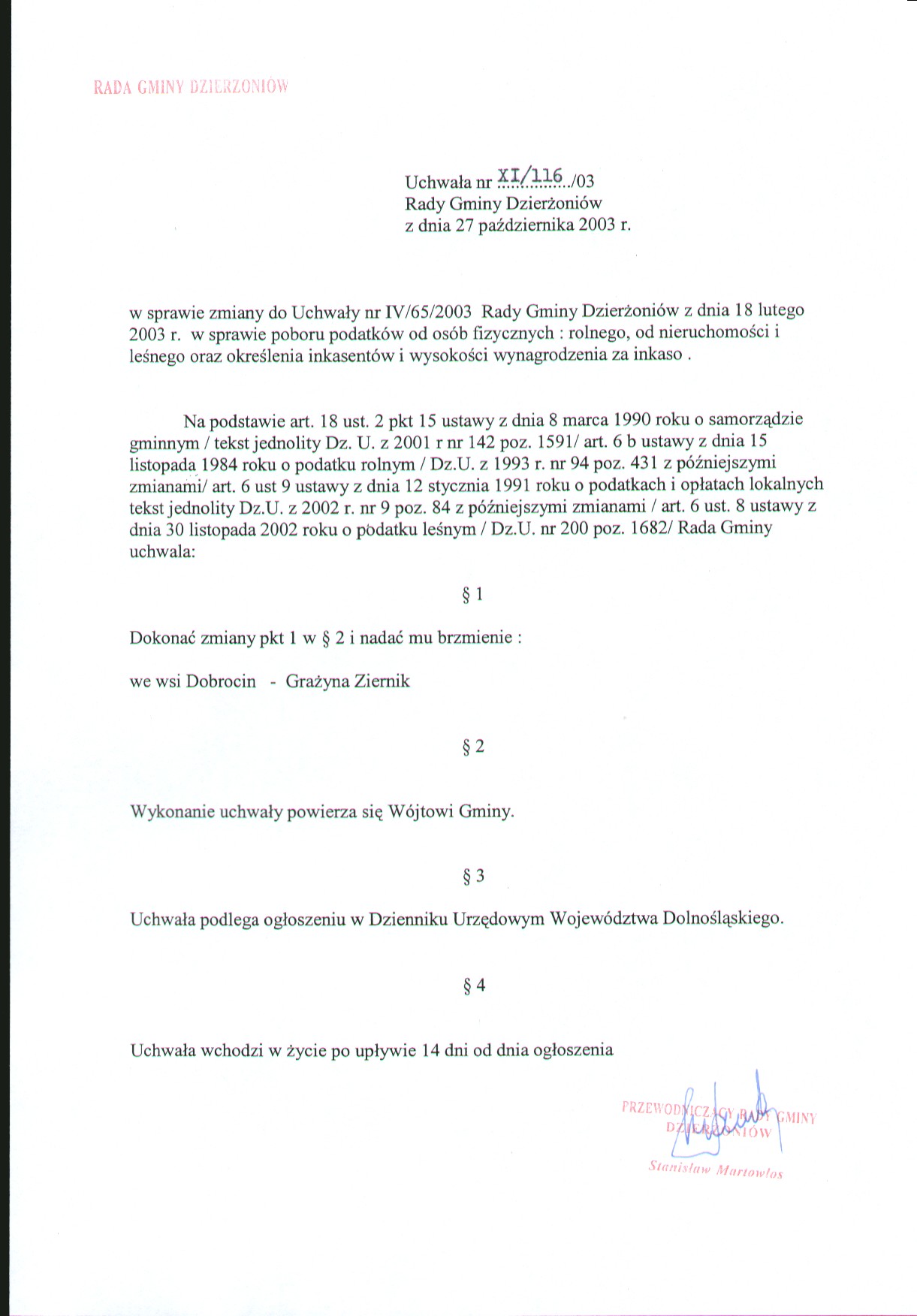 Uchwała Nr XI/116/2003 w sprawie zmiany do Uchwały nr IV/65/2003 w sprawie poboru podatków od osób fizycznych: rolnego, od nieruchomości i leśnego oraz określenia inkasentów i wysokości wynagrodzenia