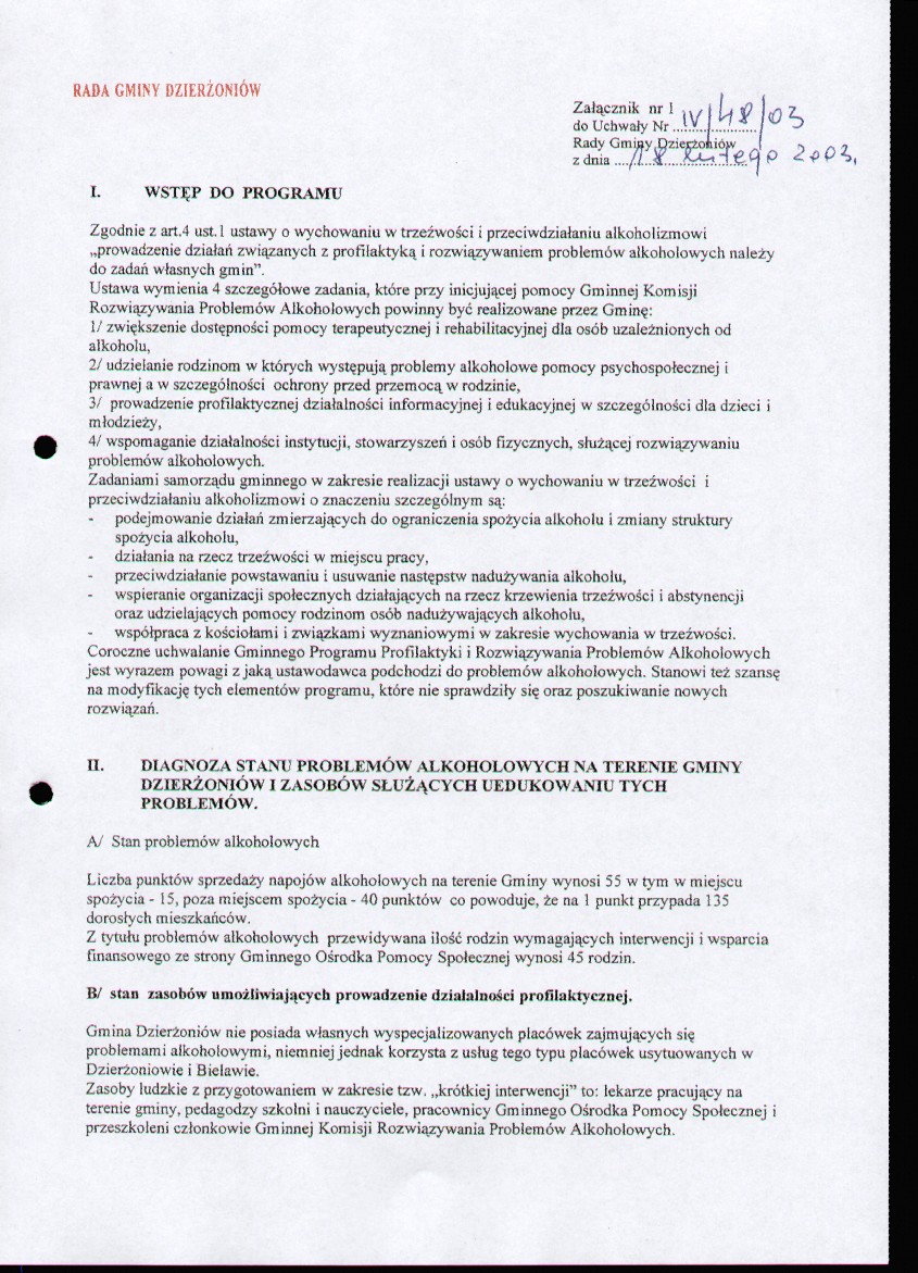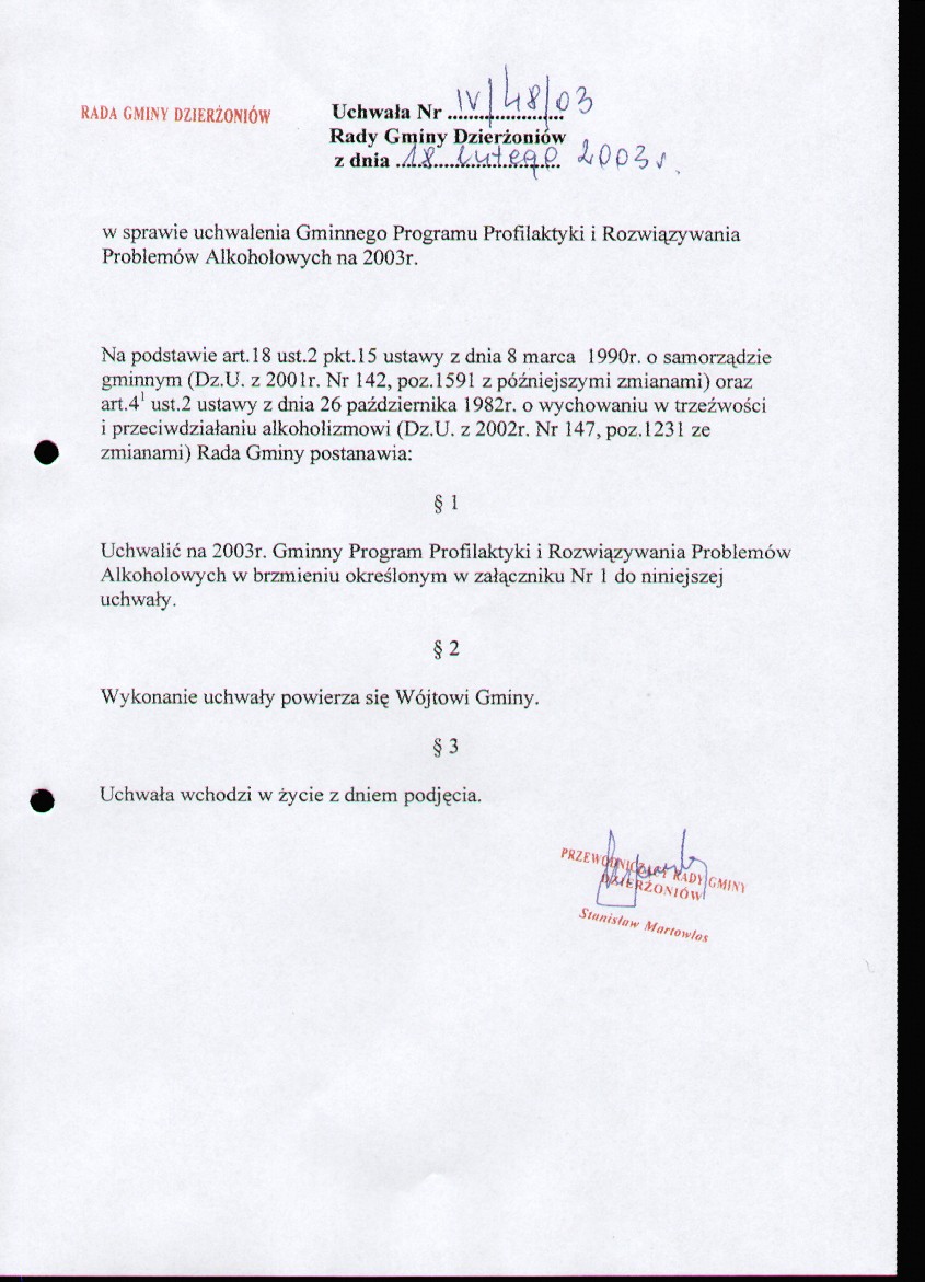 Uchwała Nr IV/48/2003 w sprawie uchwalenia Gminnego Programu Profilaktyki i Rozwiązywania Problemów Alkoholowych na rok 2003