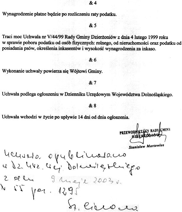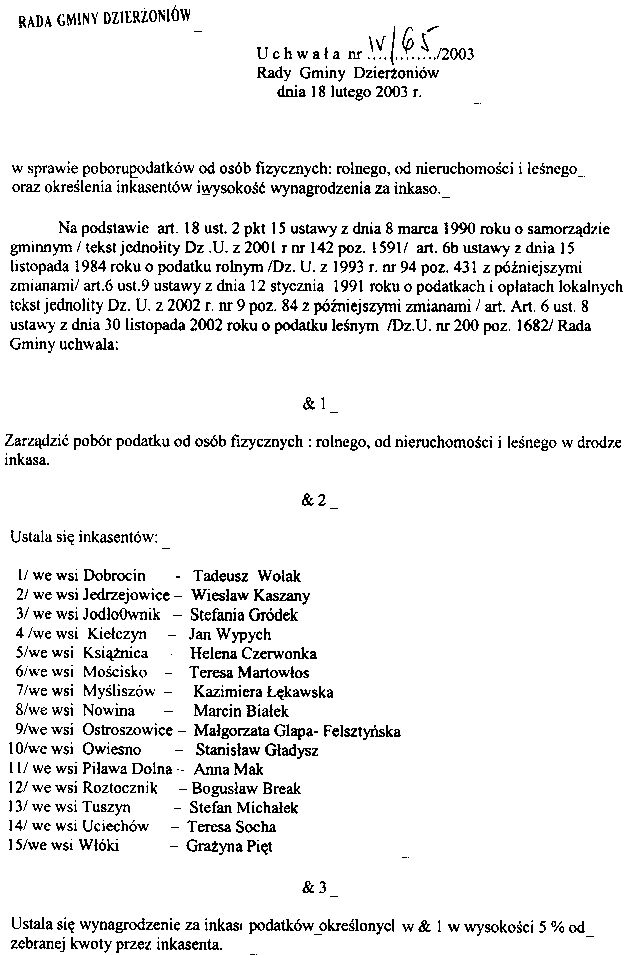 Uchwała Nr IV/65/2003 w sprawie poboru podatków od osób fizycznych: rolnego, od nieruchomości i leśnego oraz określenia inkasentów i wysokość wynagrodzenia za inkaso