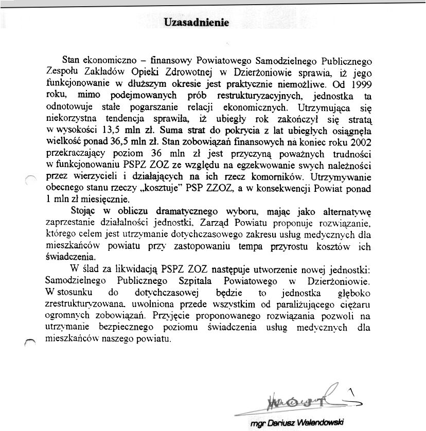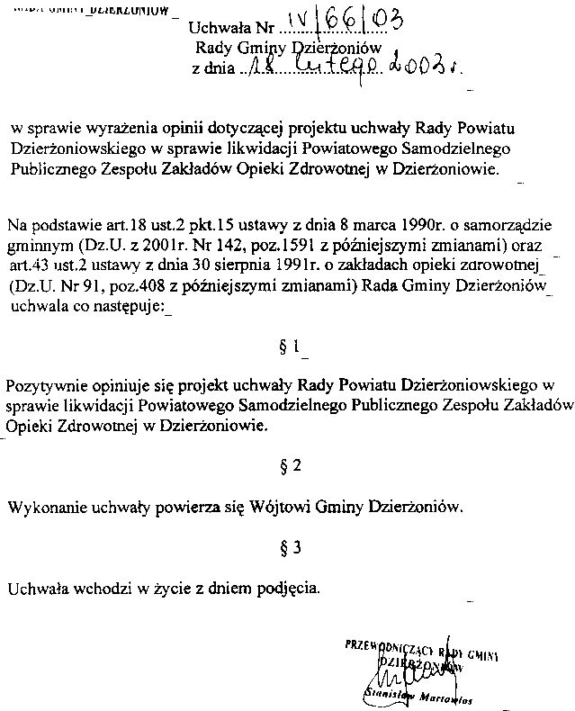 Uchwała Nr IV/66/2003 w sprawie wyrażenia opinii dotyczącej projektu uchwały Rady Powiatu Dzierżoniowskiego w sprawie likwidacji Powiatowego Samodzielnego Publicznego Zespołu ZOZ w Dzierżoniowie