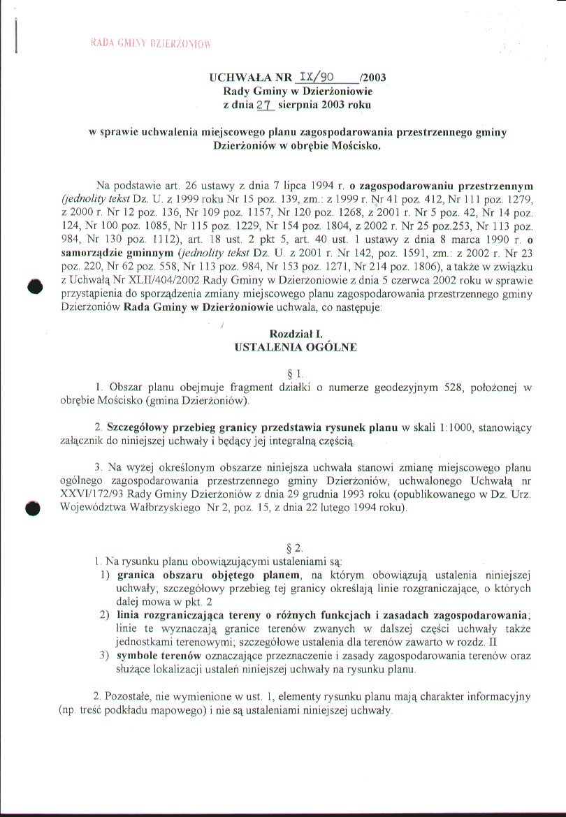 Uchwała Nr IX/90/2003 Rady Gminy Dzierżoniów w sprawie uchwalenia miejscowego planu zagospodarowania przestrzennego Dzierżoniów w obrębie Mościsko