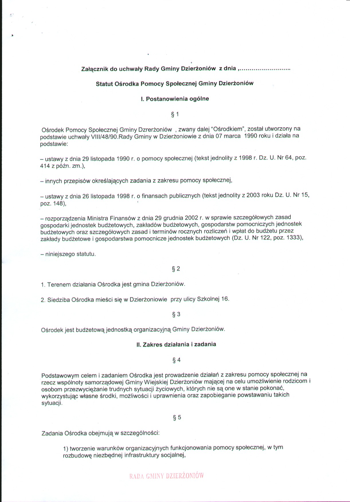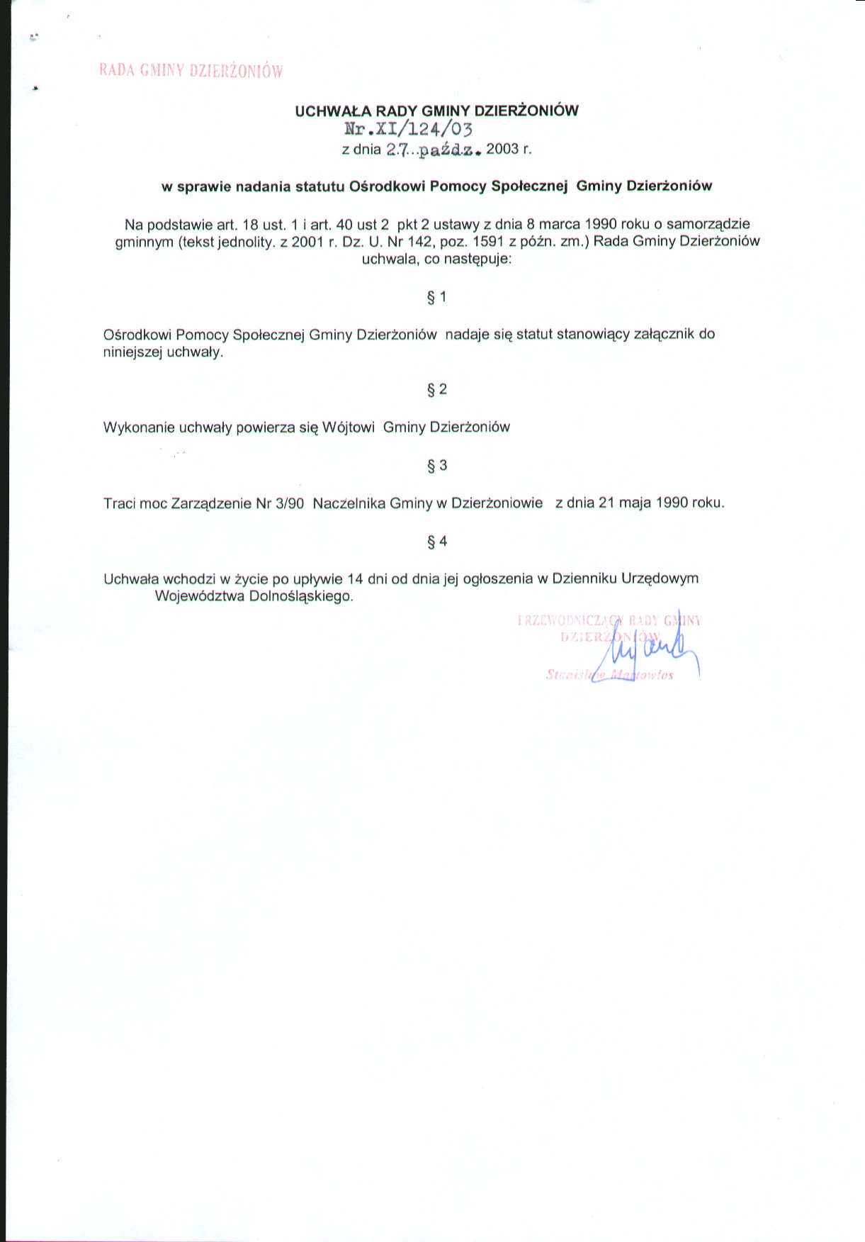 Uchwała Nr XI/124/2003 w sprawie nadania statutu Ośrodkowi Pomocy Społecznej Gminy Dzierżoniów