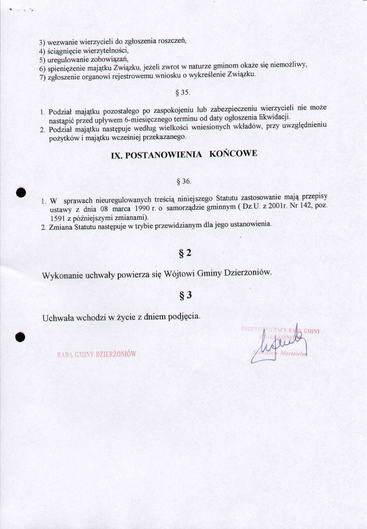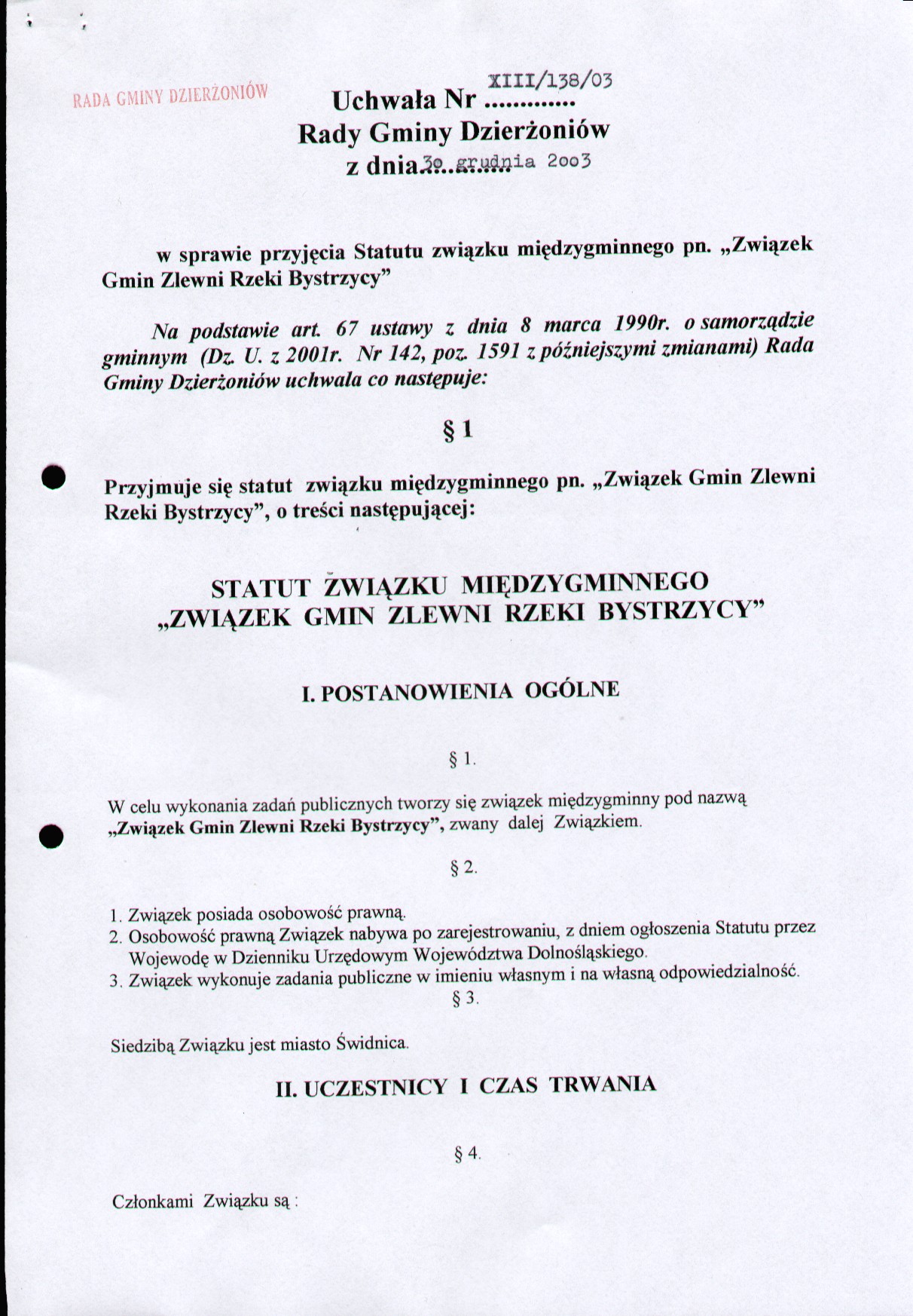 Uchwała Nr XIII/138/2003 w sprawie przyjęcia Statutu związku międzygminnego pn. "Związek Gmin Zlewni Rzeki Bystrzycy"