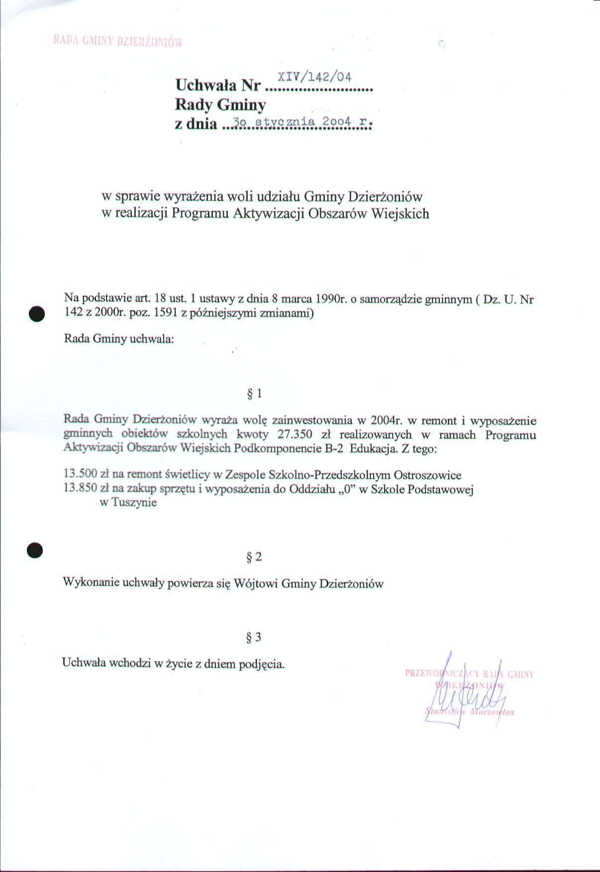 Uchwała Nr XIV/142/2004 w sprawie wyrażenia woli udziału Gminy Dzierżoniów w realizacji Programu Aktywizacji Obszarów Wiejskich