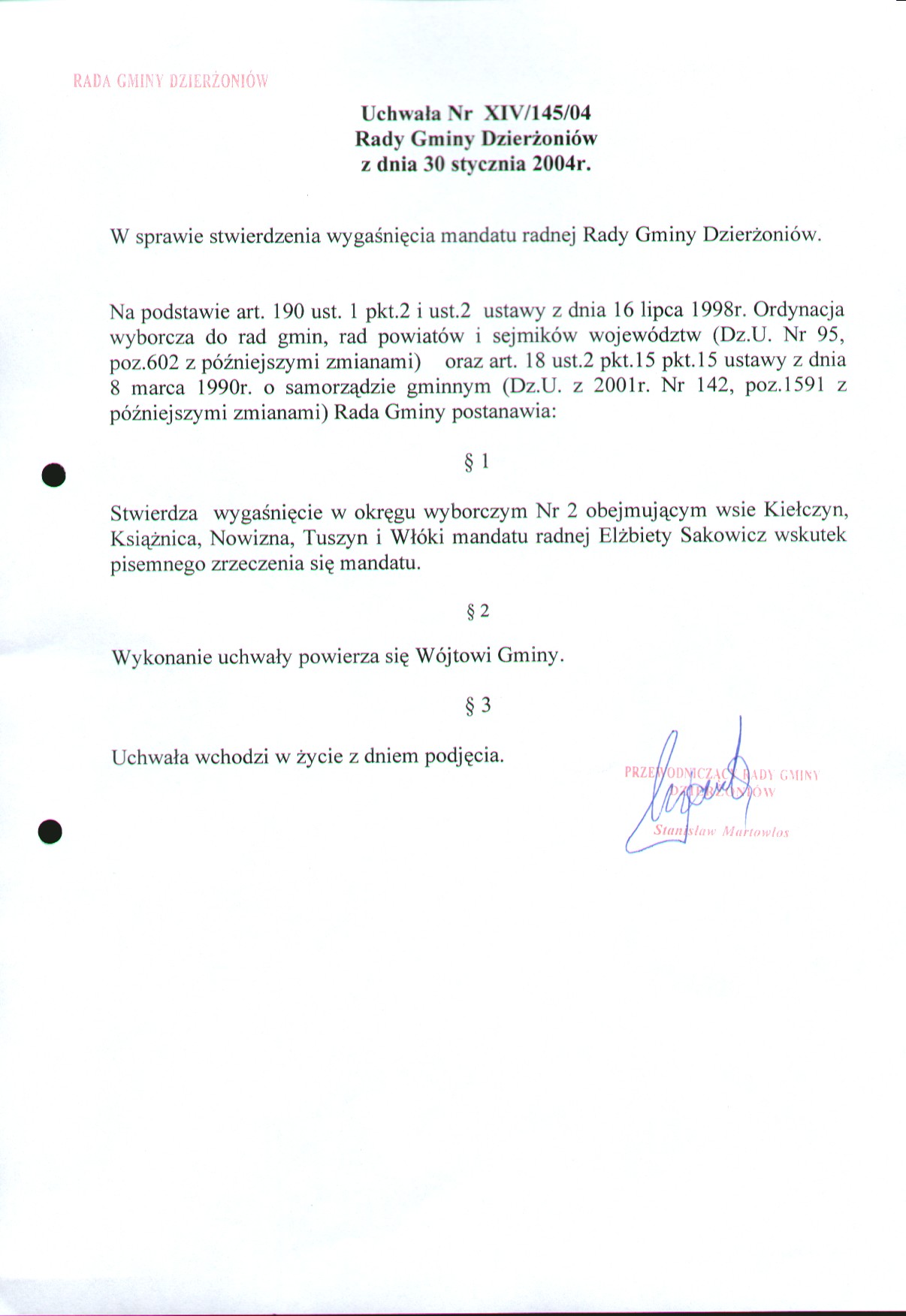 Uchwała Nr XIV/145/2004 w sprawie wygaśnięcia mandatu radnej Rady Gminy Dzierżoniów