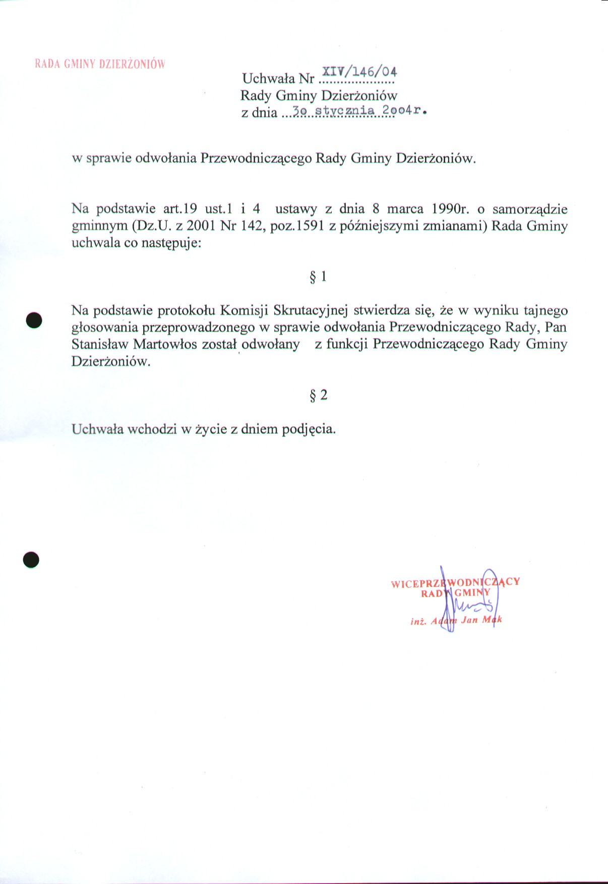 Uchwała Nr XIV/146/2004 w sprawie odwołania Przewodniczącego Rady Gminy Dzierżoniów
