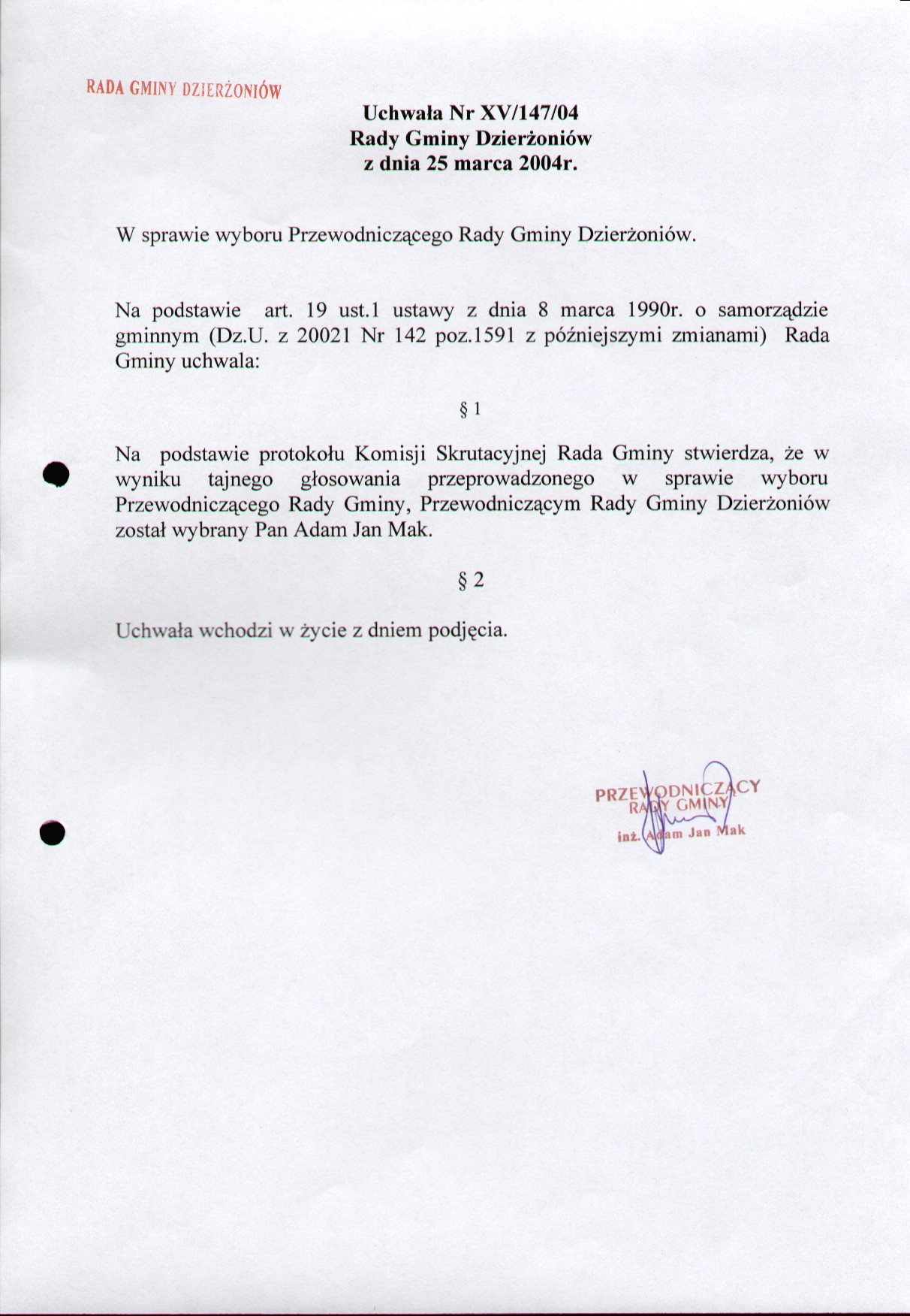 Uchwała Nr XV/147/2004 w sprawie wyboru Przewodniczącego Rady Gminy Dzierżoniów