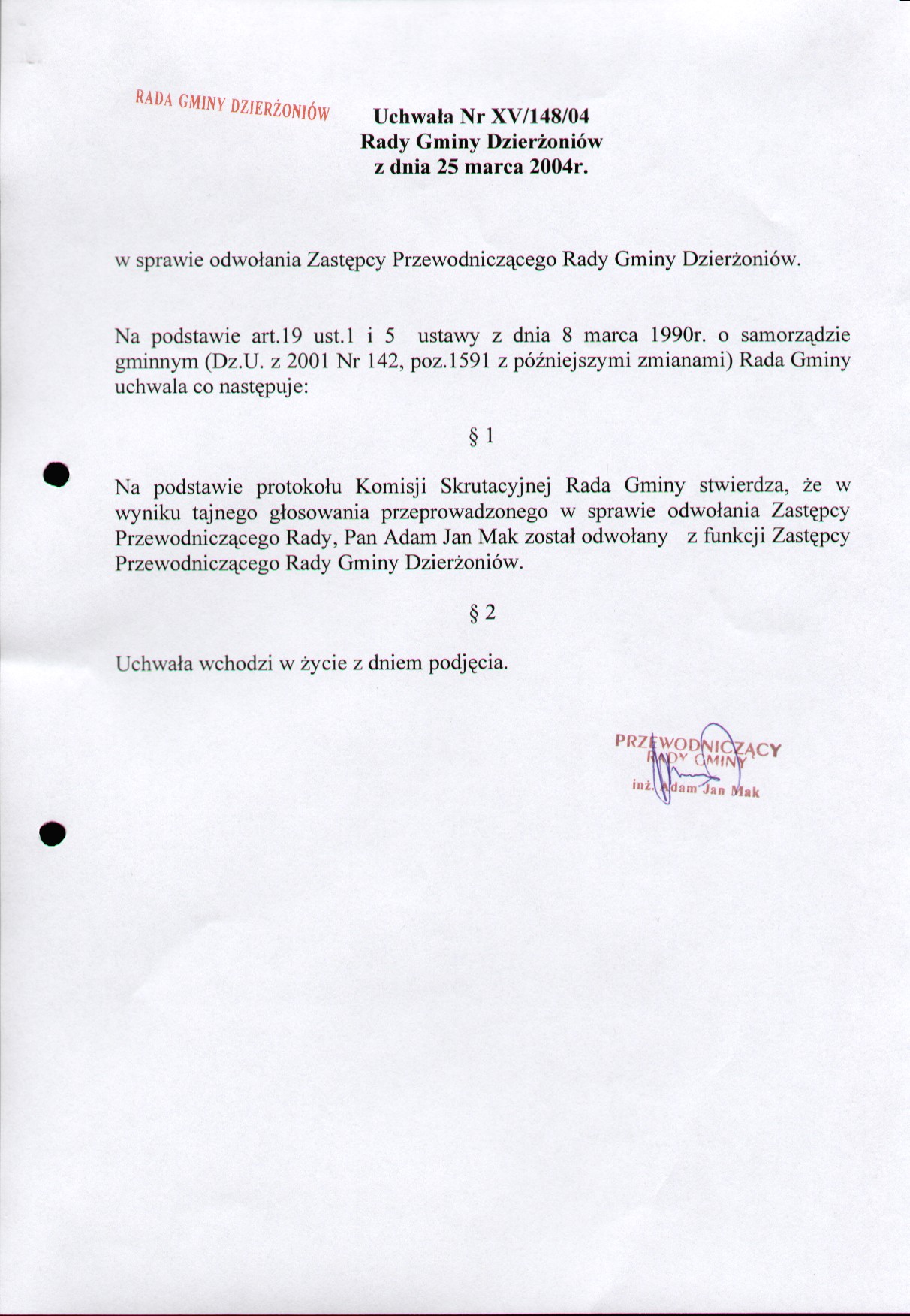 Uchwała Nr XV/148/2004 w sprawie odwołania Przewodniczącego Rady Gminy Dzierżoniów