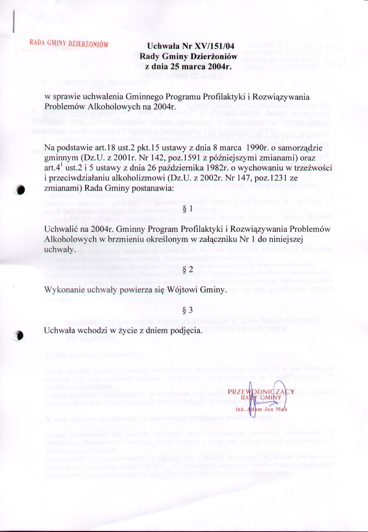 Uchwała Nr XV/151/2004 w sprawie uchwalenia gminnego Programu Profilaktyki i Rozwiązywania Problemów Alkoholowych na 2004r.