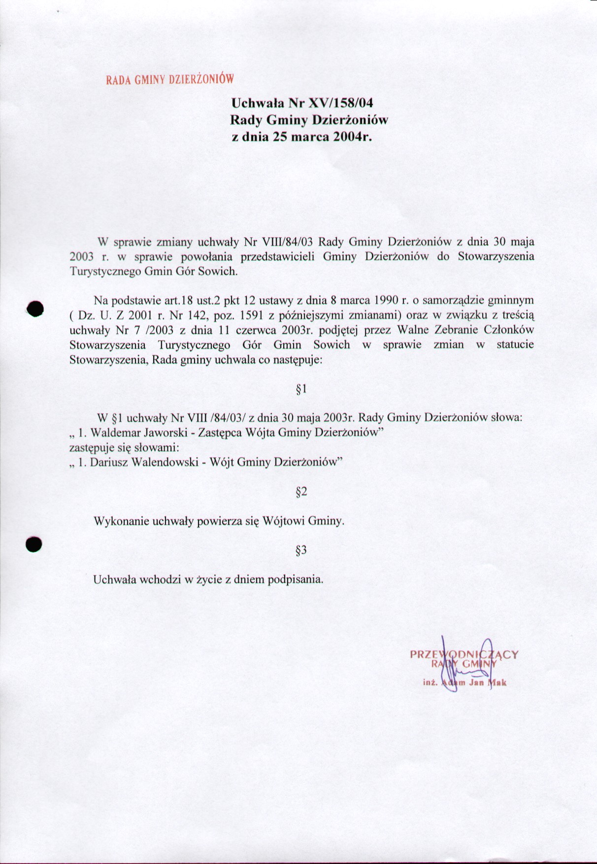 Uchwała Nr XV/158/2004 w sprawie zmiany uchwały Nr VIII/84/03 Rady Gminy z dnia 30 maja 2003r. w sprawie powołania przedstawicieli Gminy Dzierżoniów do Stowarzyszenia Turystycznego Gmin Gór Sowich