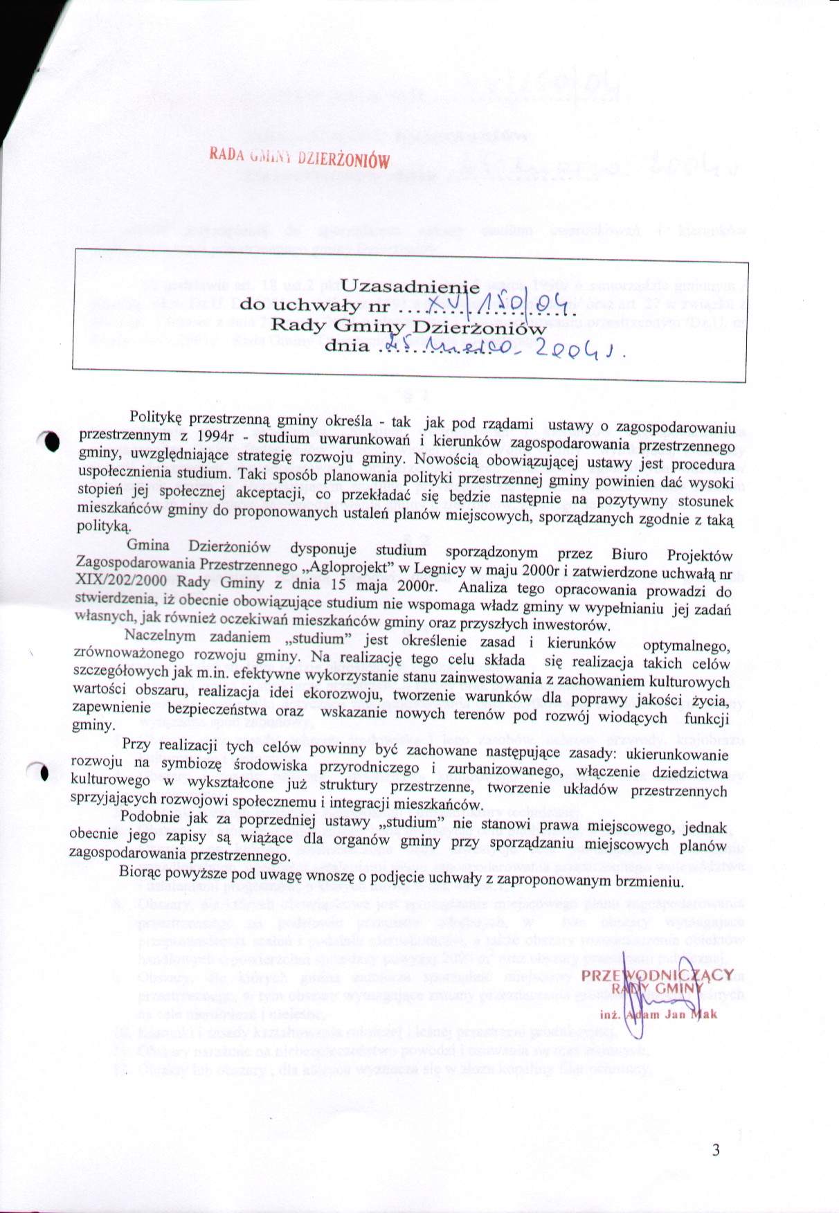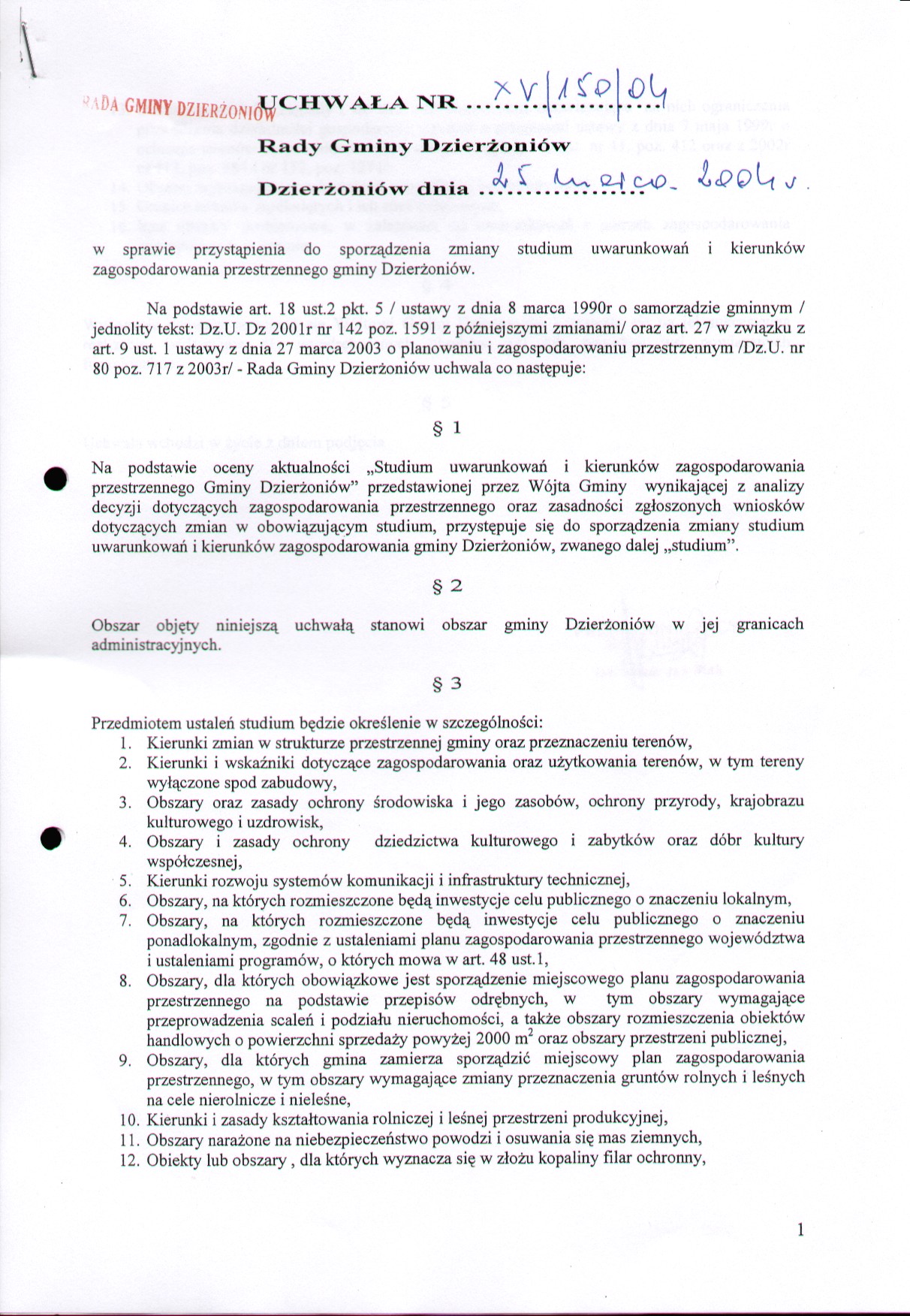 Uchwała Nr XV/150/2004 w sprawie przystąpienia do sporządzenia zmiany studium uwarunkowań i kierunków zagospodarowania przestrzennego Gminy Dzierżoniów