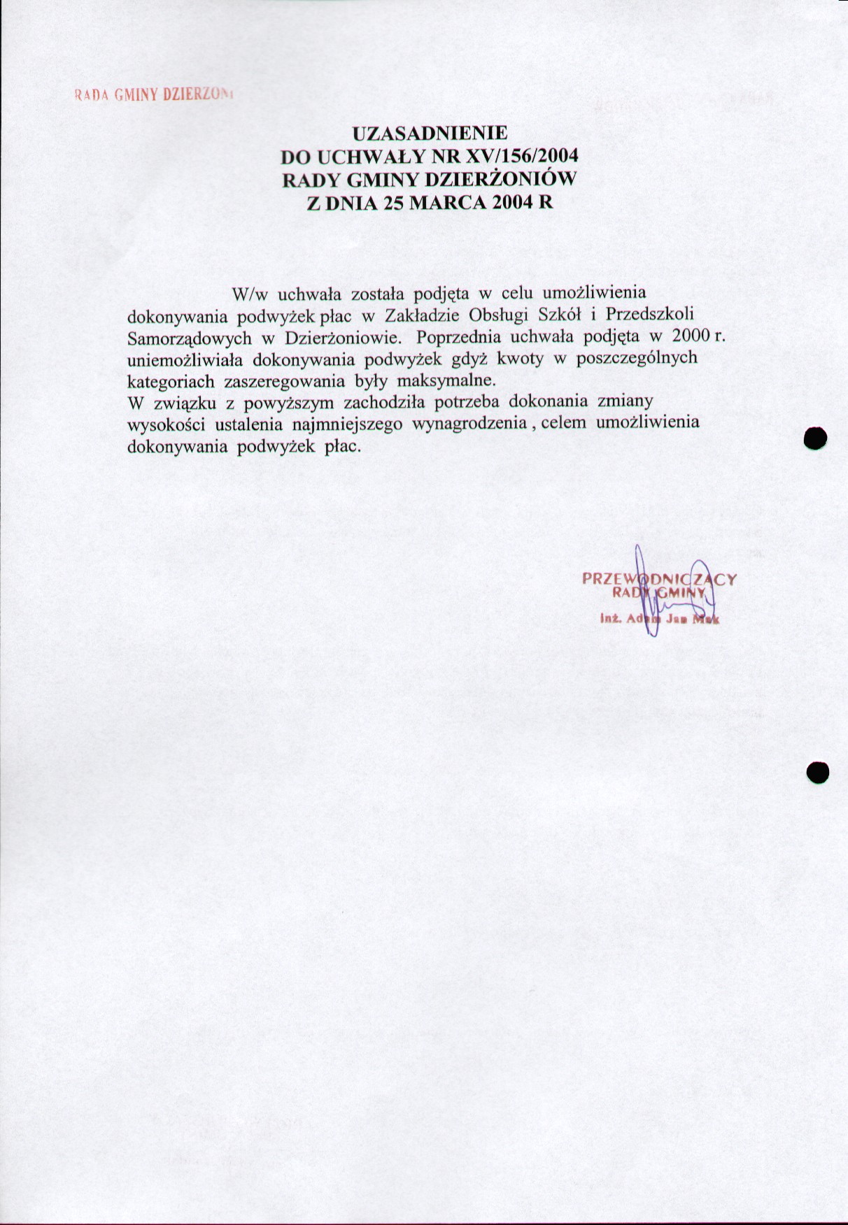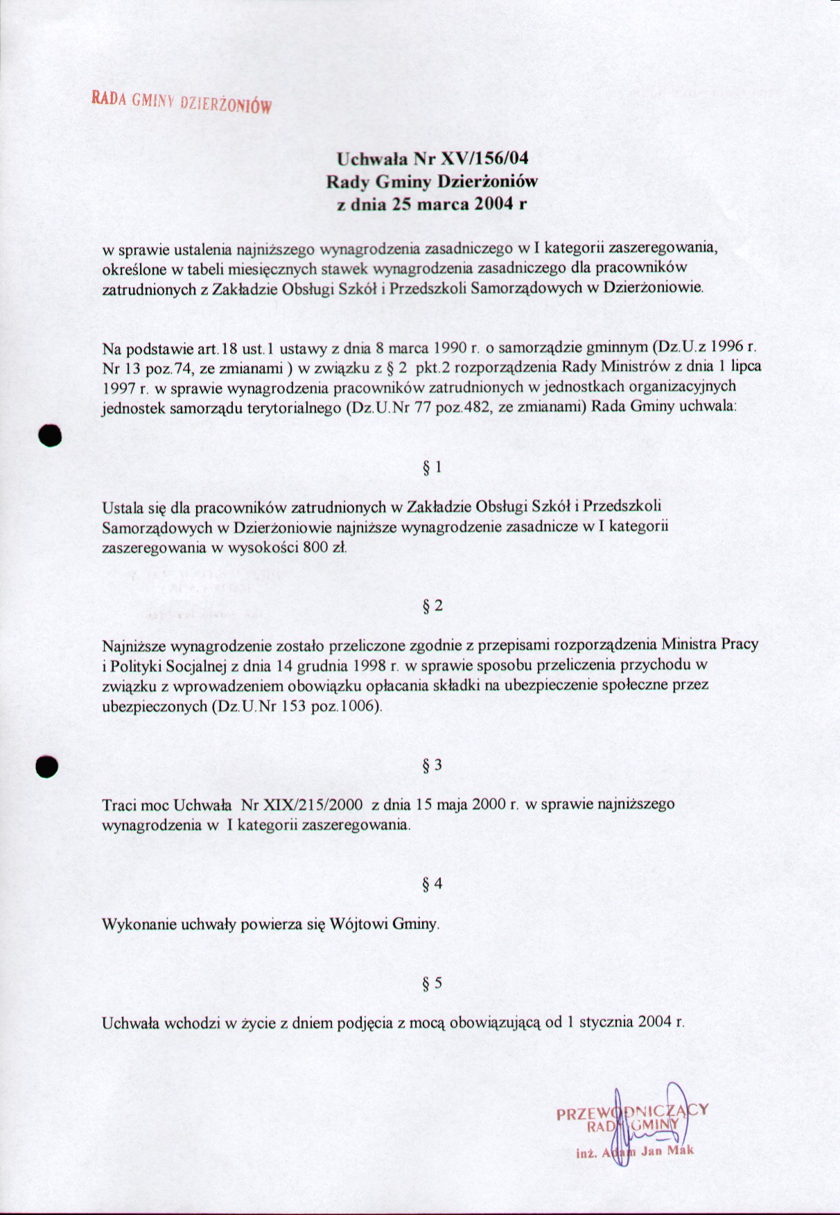 Uchwała Nr XV/156/2004 w sprawie ustalenia najniższego wynagrodzenia zasadniczego w I kategorii zaszeregowania określone w tabeli miesięcznych stawek wynagrodzenia zasadniczego dla pracowników zatrudn