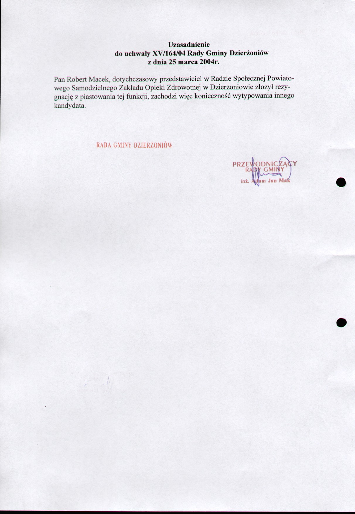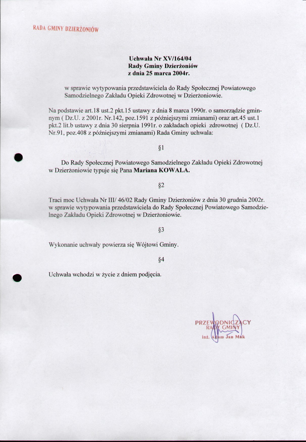 Uchwała Nr XV/164/2004 w sprawie wytypowania przedstawiciela do Rady Społecznej Powiatowego Samodzielnego Zakładu Opieki Zdrowotnej w Dzierżoniowie