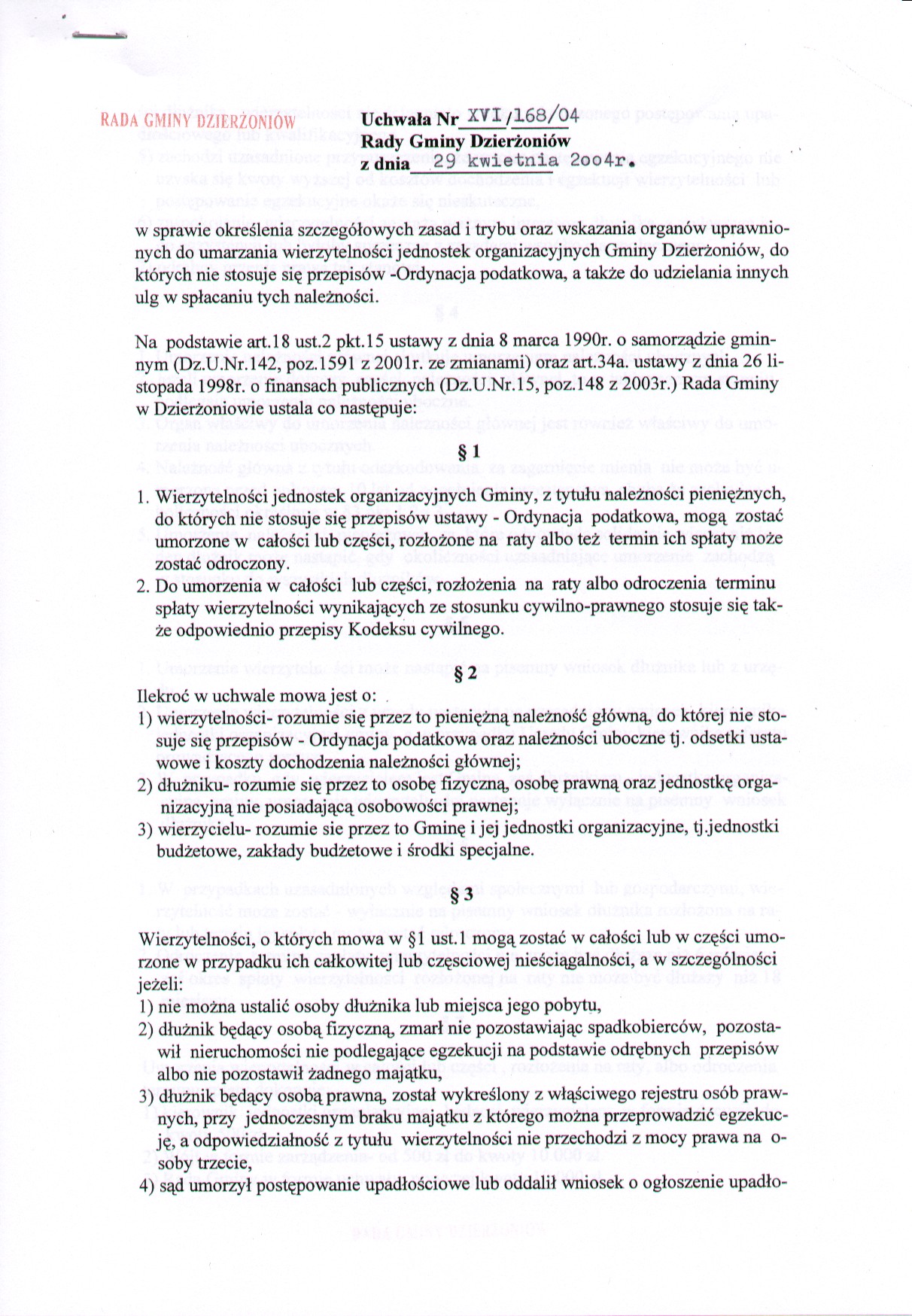 Uchwała Nr XVI/168/2004 w sprawie określenia szczegółowych zasad i trybu oraz wskazania organów uprawninych do umarzania wierzytelności jednostek organizacyjnych Gminy Dzierżoniów, do których nie stos