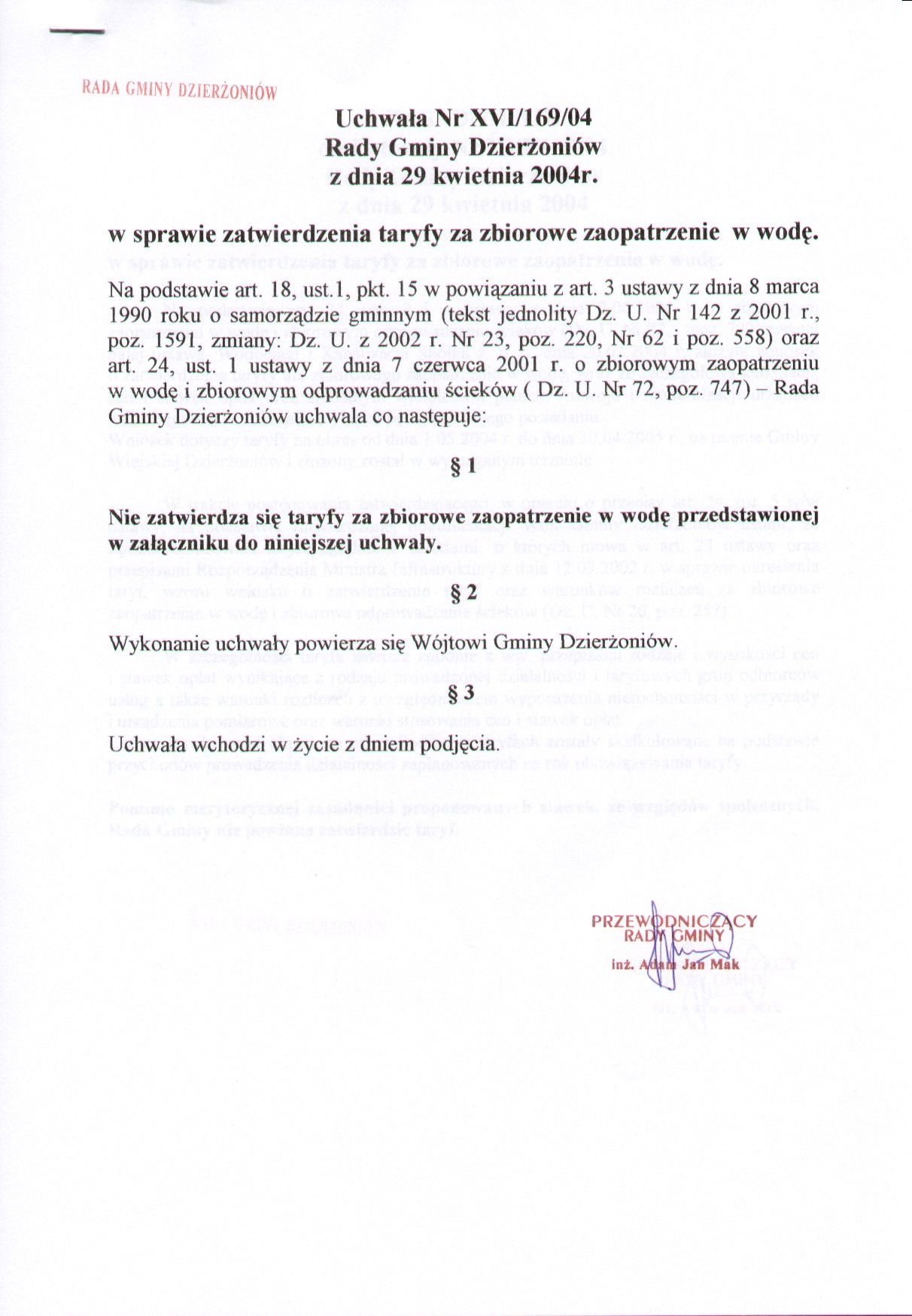 Uchwała Nr XVI/169/2004 w sprawie zatwierdzenia taryfy za zbiorowe zaopatrzenie w wodę
