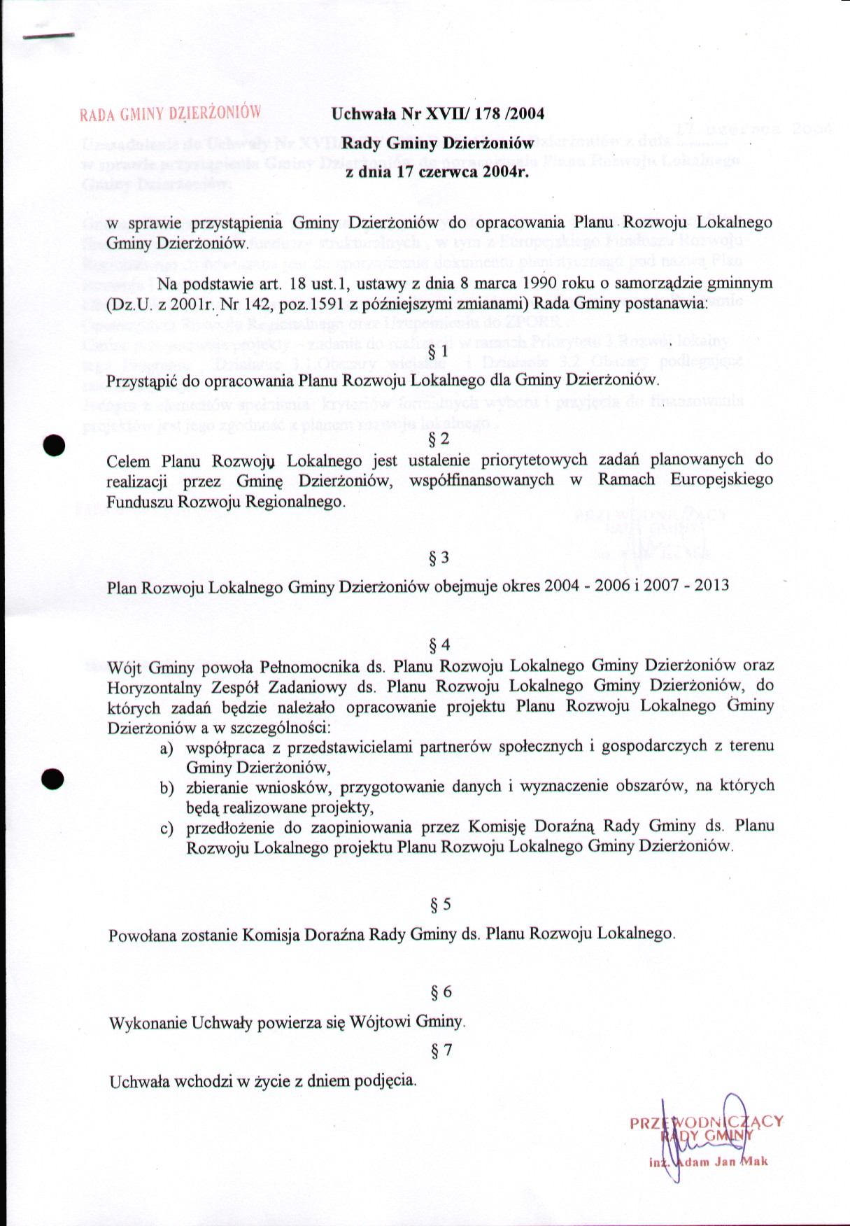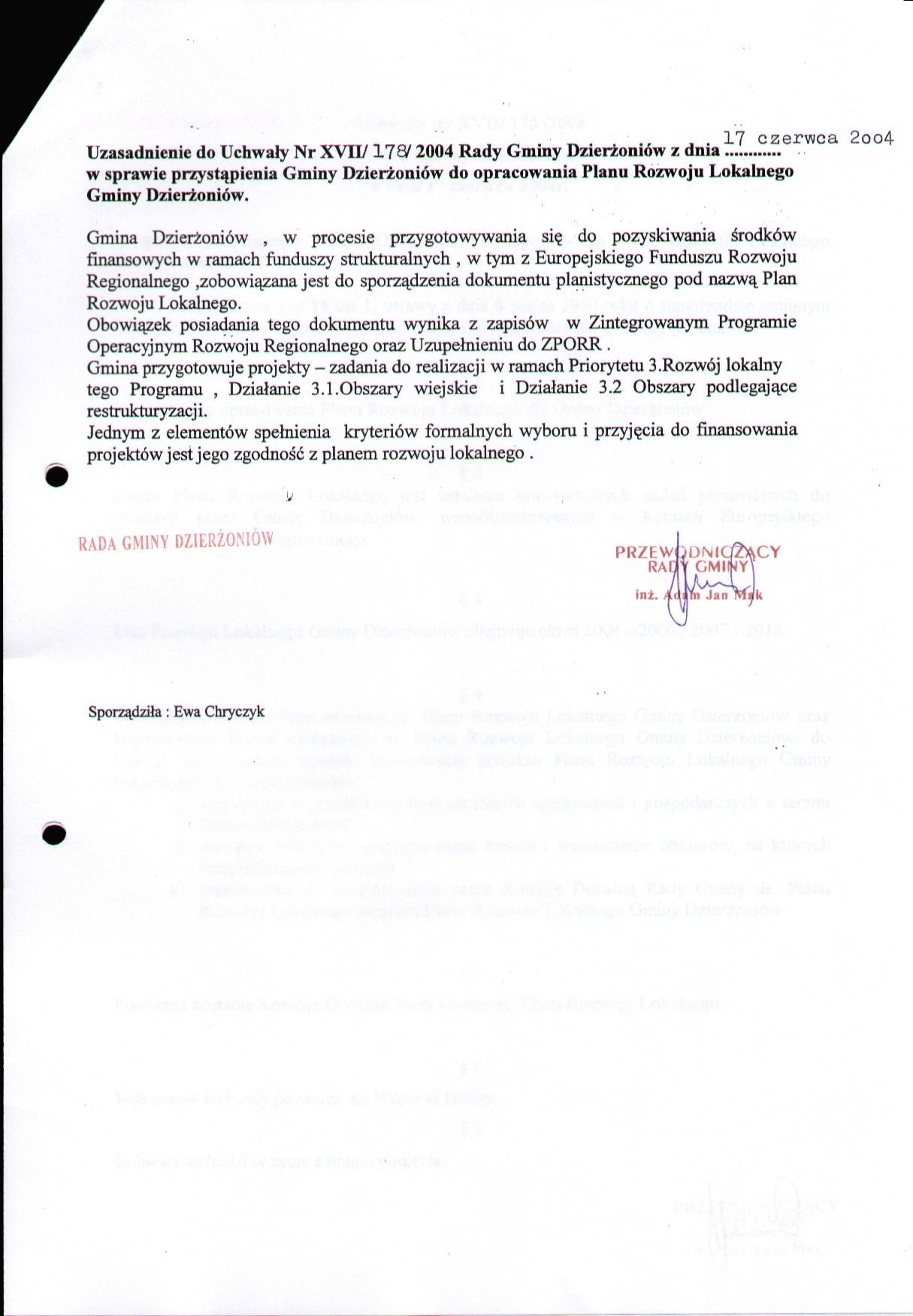 Uchwała nr XVII/178/2004 w sprawie przystąpienia Gminy Dzierżoniów do opracowania Planu Rozwoju Lokalnego Gminy Dzierżoniów
