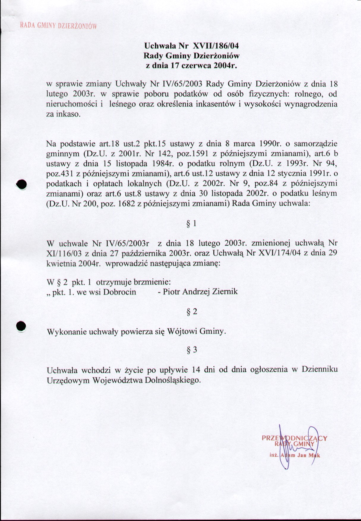 Uchwała nr XVII/186/04 w sprawie zmiany uchwały Nr IV/65/2003 z dnia 18.02.2003 w sprawie poboru podatków od osób fizycznych: rolnego, od nieruchomości i leśnego oraz określenia inkasentów i wysokości