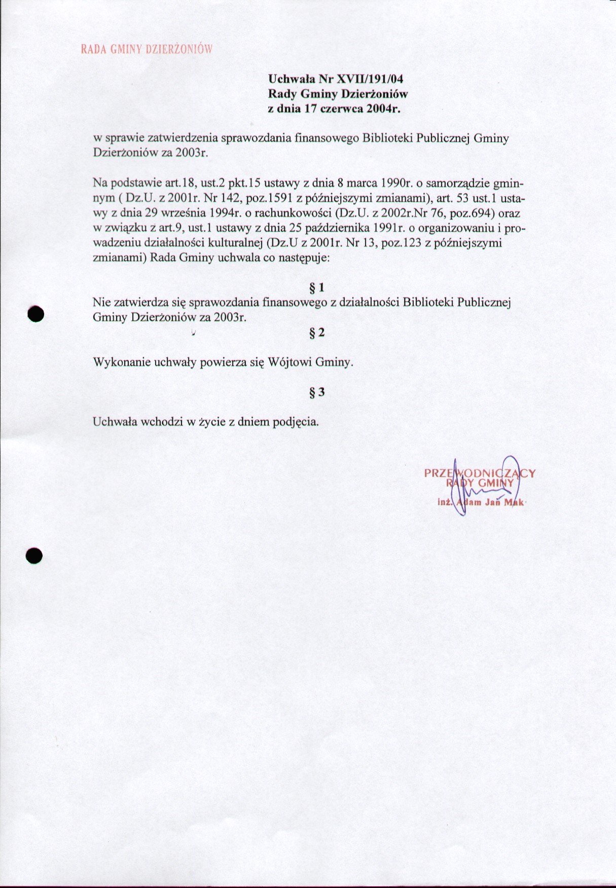 Uchwała nr XVII/191/04 w sprawie zatwierdzenia sprawozdania finansowego Biblioteki Publicznej Gminy Dzierżoniów