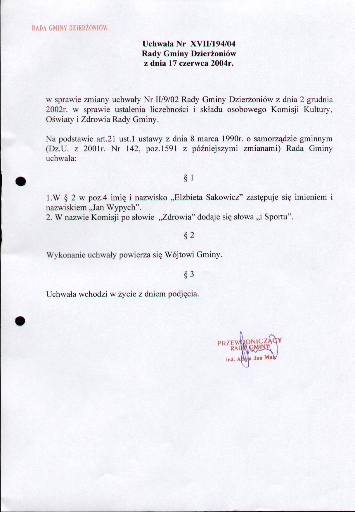 Uchwała nr XVII/194/04 w sprawie zmiany uchwały Nr II/9/02 Rady Gminy Dzierżoniów z dnia 02.12 2002r. w sprawie zmiany ustalenia liczebności i składu osobowego Komisji Kultury, Oświaty i Zdrowia Rady