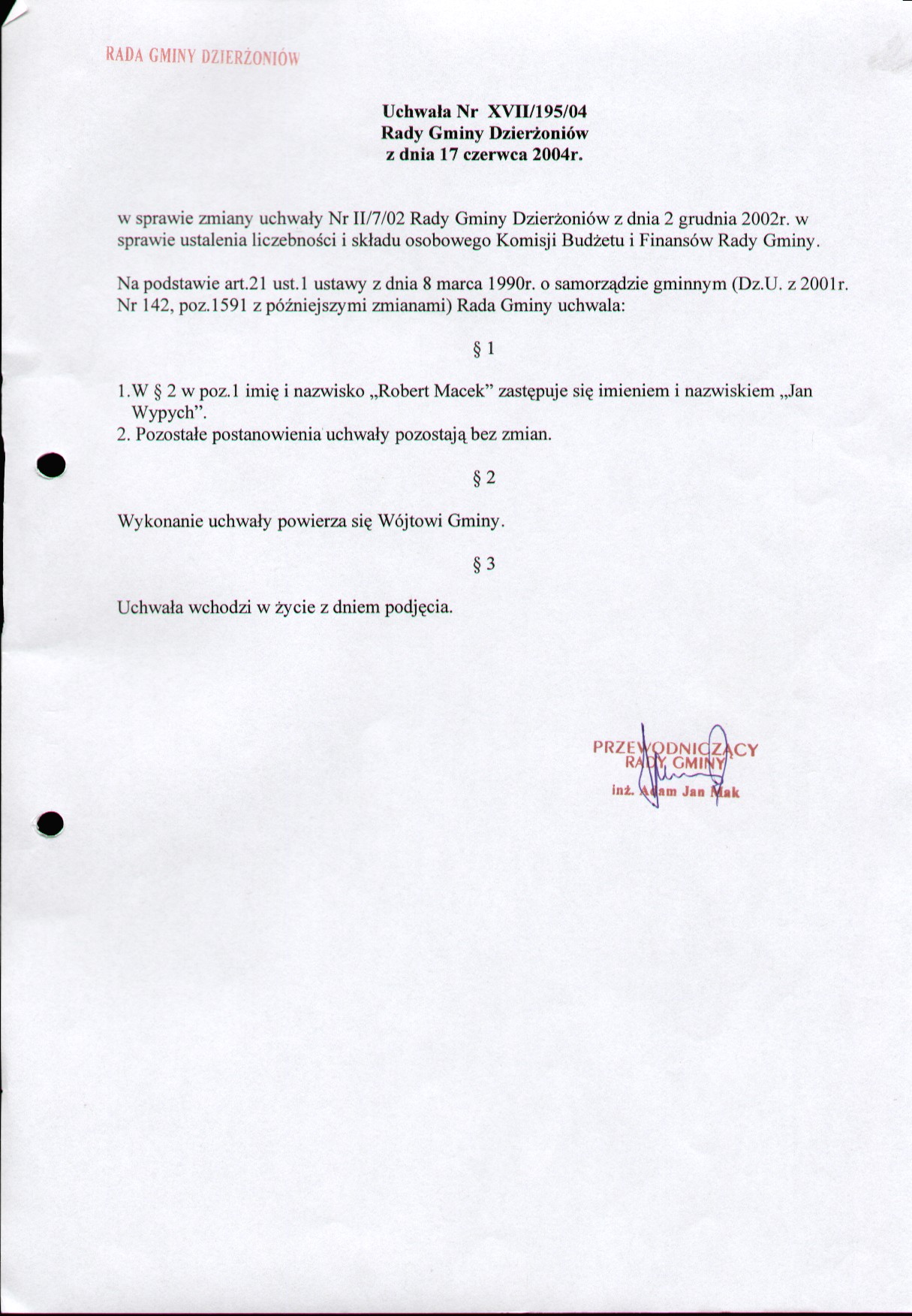 Uchwała nr XVII/195/04 w sprawie zmiany uchwały Nr II/7/02 Rady Gminy Dzierżoniów z dnia 02.12 2002r. w sprawie zmiany ustalenia liczebności i składu osobowego Komisji Budżetu i Finansów Rady Gminy