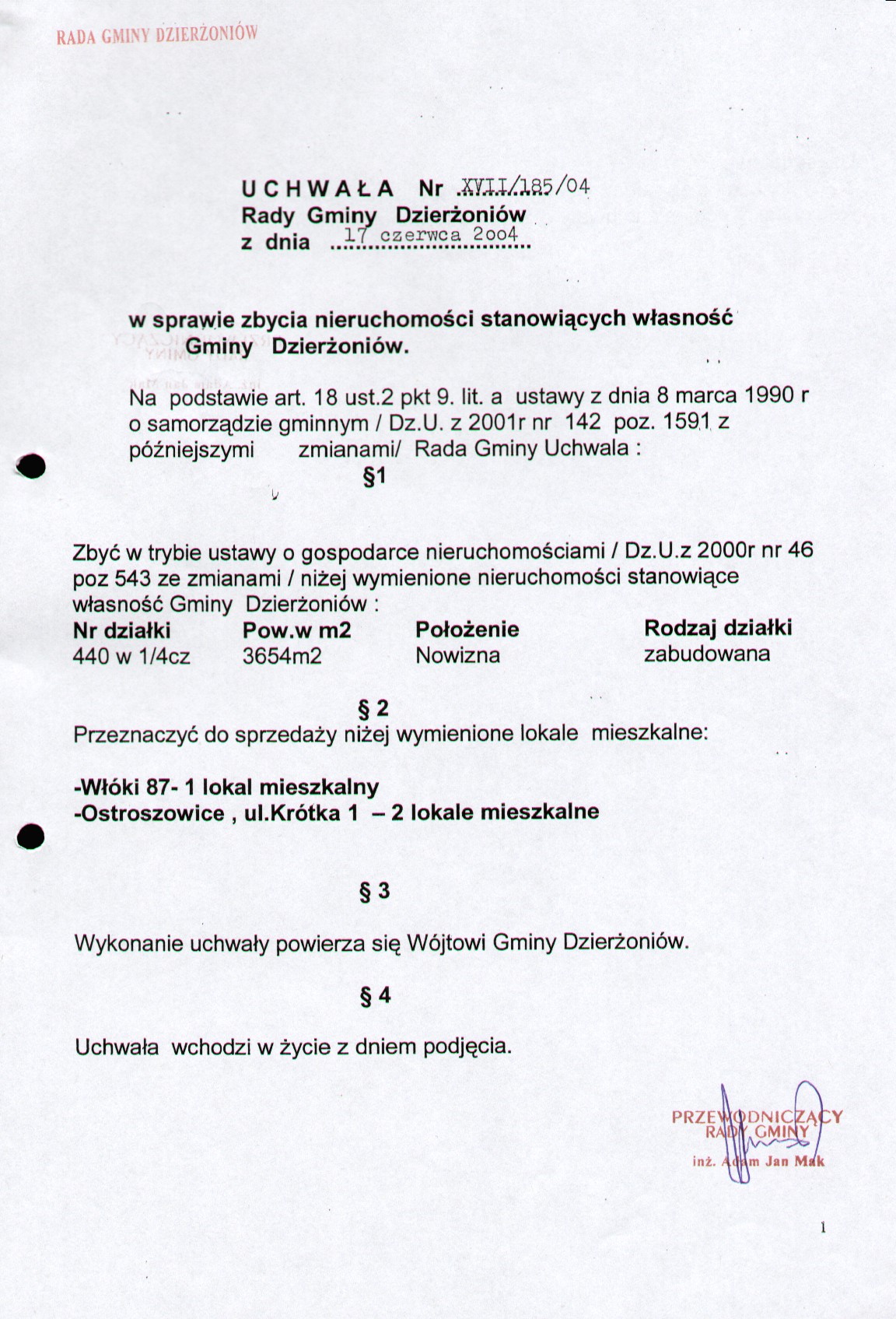 Uchwała nr XVII/185/2004 w sprawie zbycia nieruchomości stanowiących własność gminy Dzierżoniów.