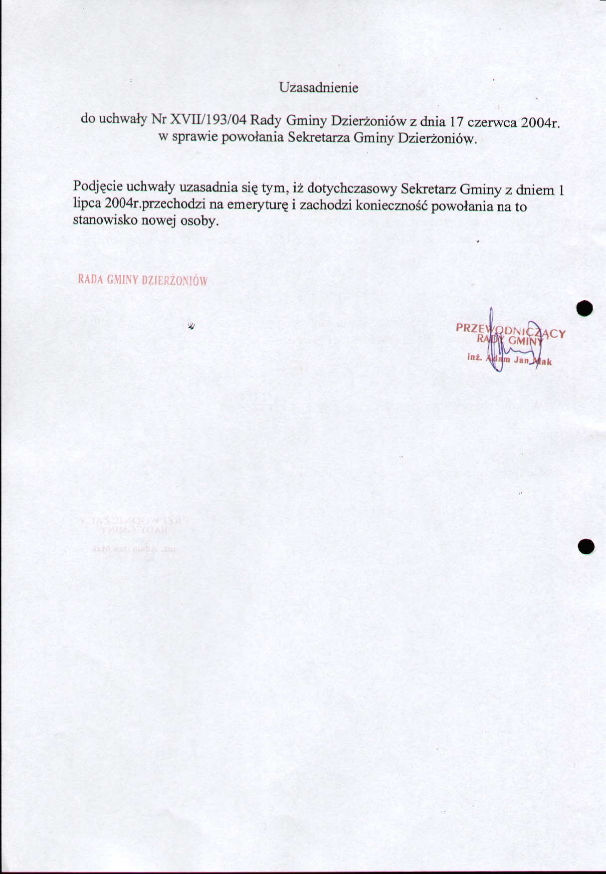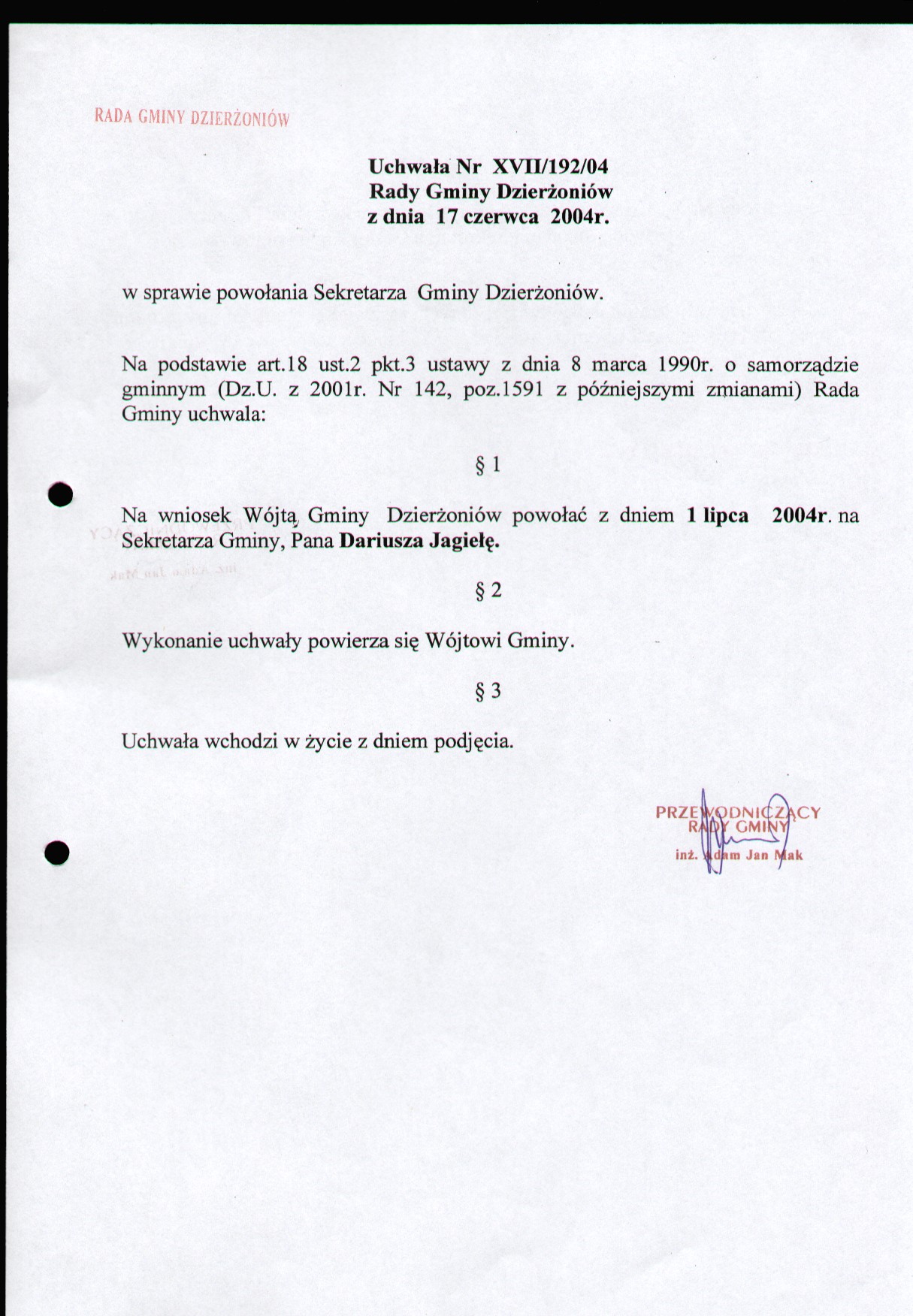 Uchwała nr XVII/192/04 w sprawie powołania Sekretarza Gminy Dzierżoniów