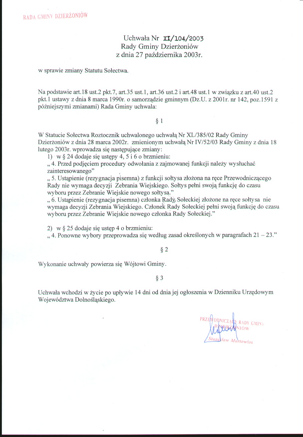 Uchwała Nr XI/104/2003 w sprawie zmiany Statutu Sołectwa Roztocznik