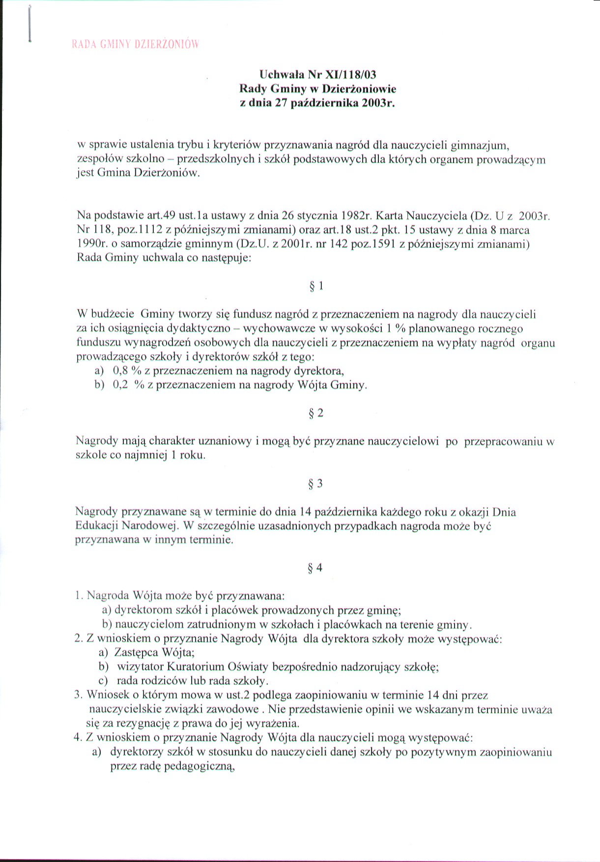 Uchwała Nr XI/118/2003 w sprawie ustalenia trybu i kryteriów przyznawania nagród dla nauczycieli gimnazjum, zespołów szkolno - przedszkolnych i szkół podstawowych dla których organem prowadzącycm jest